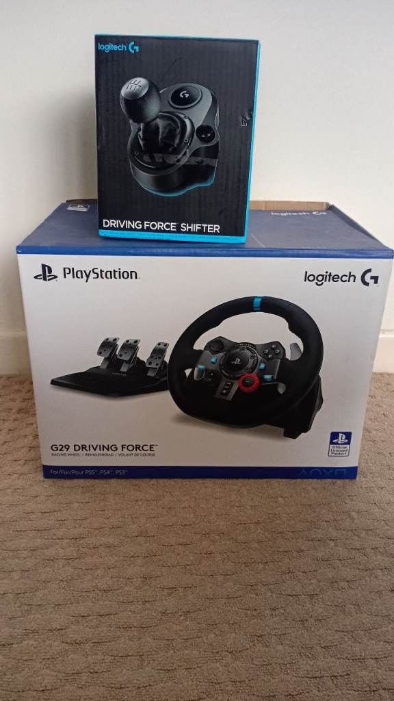 Logitech g29 driving force steering wheel with gear shifter and the 3 pedal version so good if you like drifting or real simulation games like gt7. I still have the original box for these.