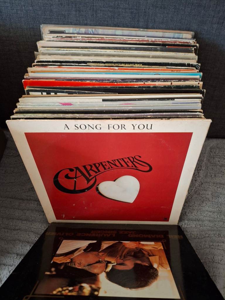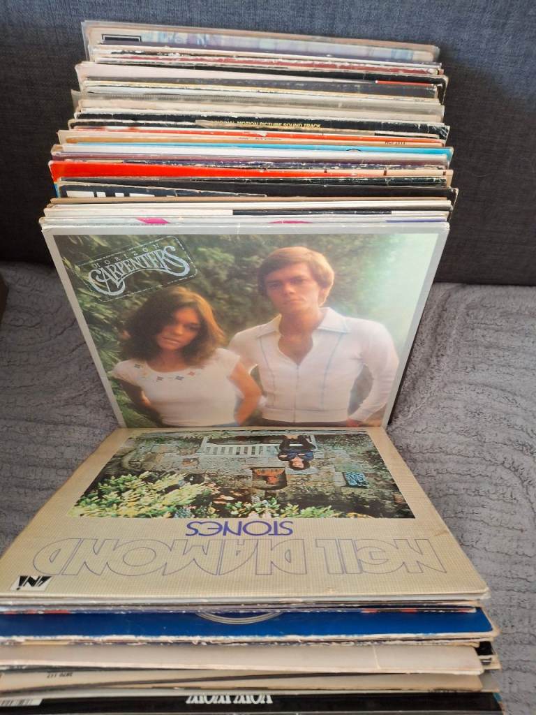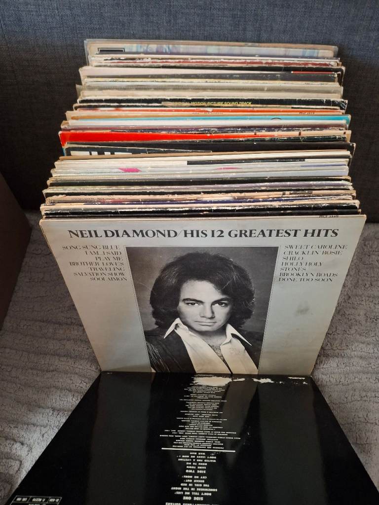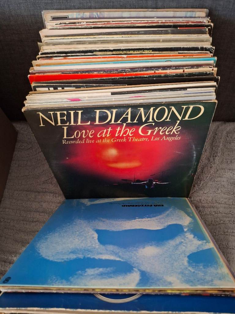 Mixed vinyl records including Sinatra, Rod Stewart, Neil Diamond, Sayer, Carpenters, Streisand, Abba, Elvis Presley and more.
