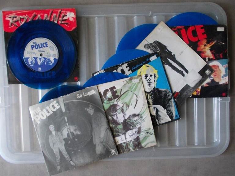 Set of 6 Blue Vinyl Singles. Titles- Roxanne, Message in a bottle, The beds too big without you, So lonely, Walking on the moon, Can't stand losing you. Cash on collection only, from Folkestone £50