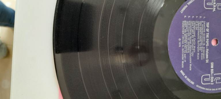Top of the Pops Vinyl record vol. 54, some marks on records cover as per pictures, the record is in excellent condition but the is a mark on side two as per picture, I do not have a record player so not sure if this effect the sound of the record.
