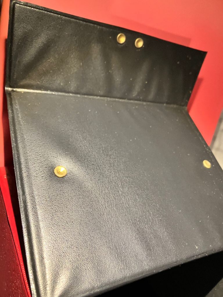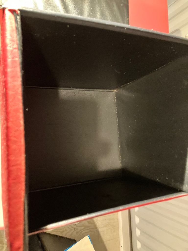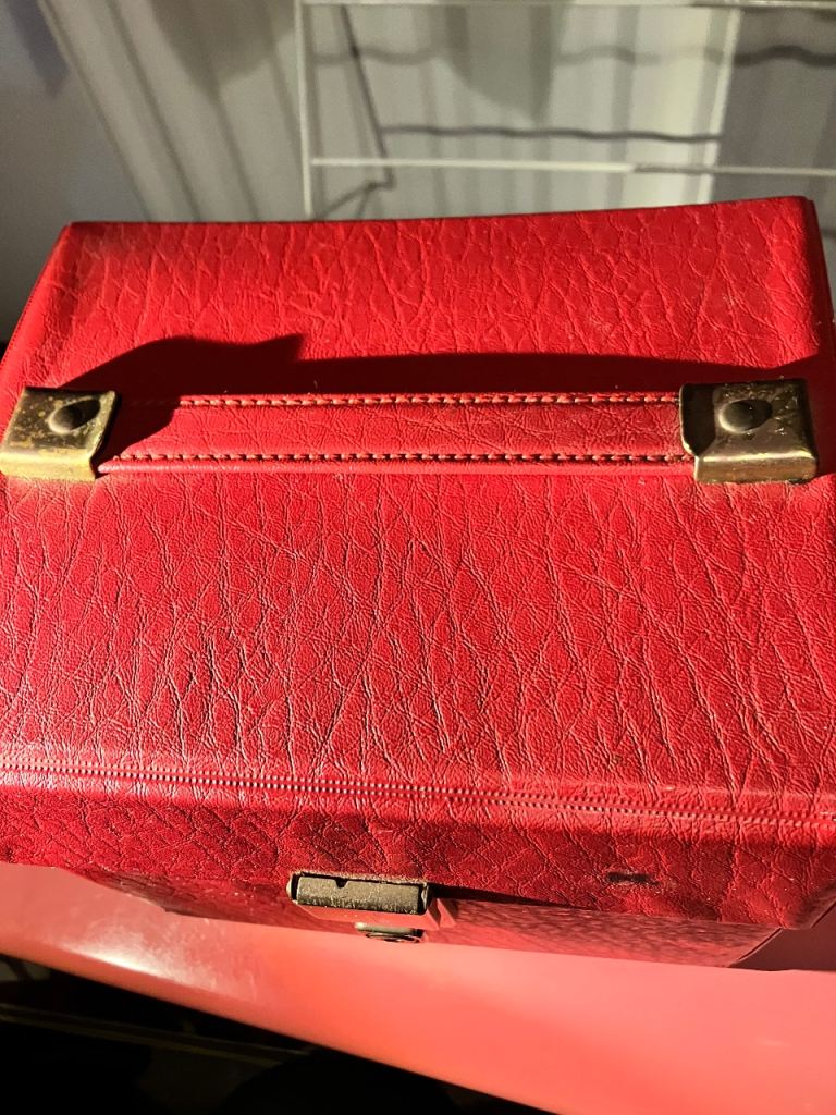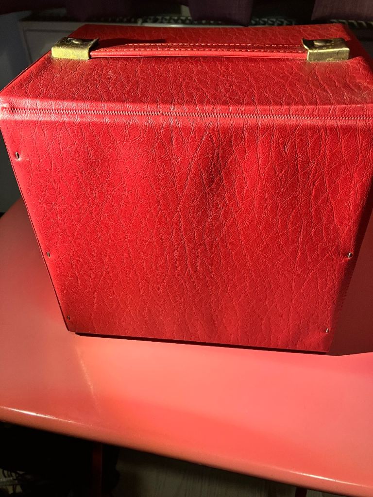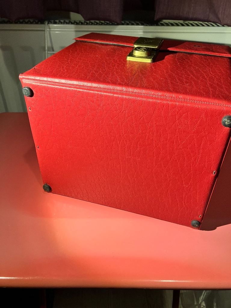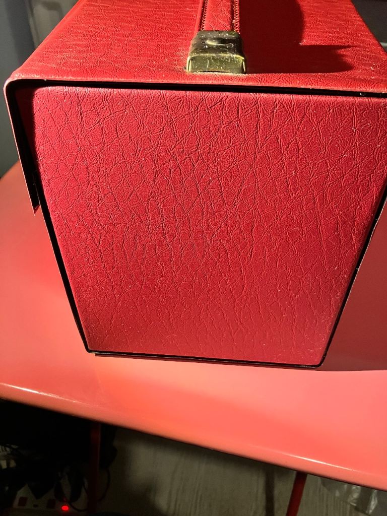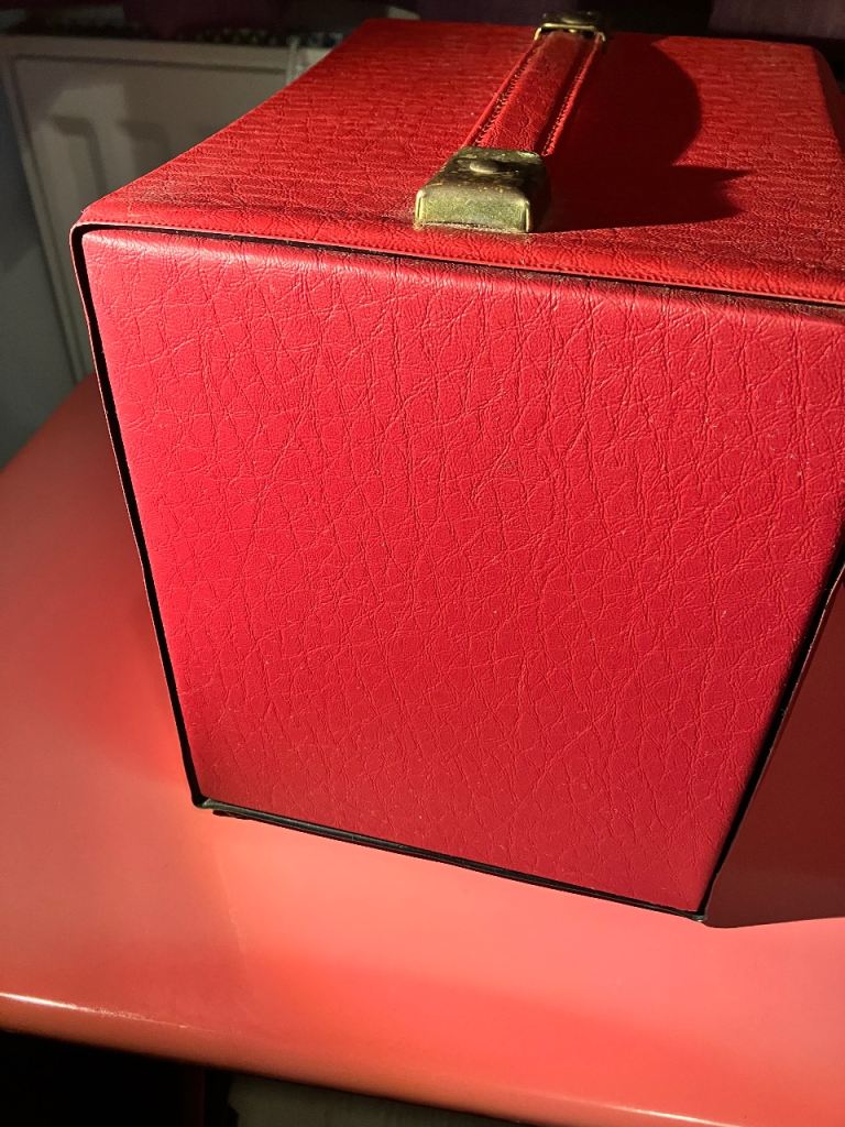 Vintage record box, only had a quick clean (so may need a deeper clean) and only has some small marks including a tiny bit of black pen on front flap.