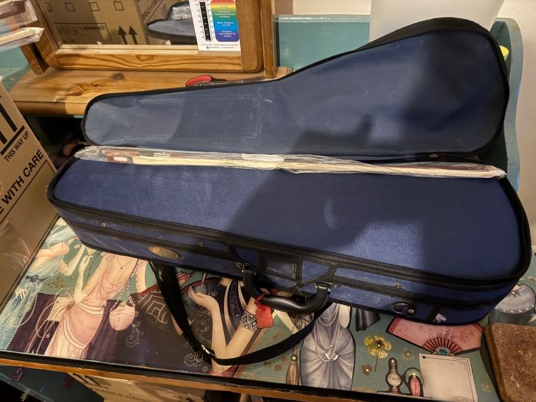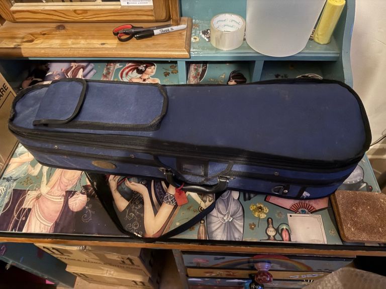 3/4 violin in hard case. Beautiful little violin well looked after. Case is quite dusty outside, but inside good condition, and extra bow in case (2 in total).