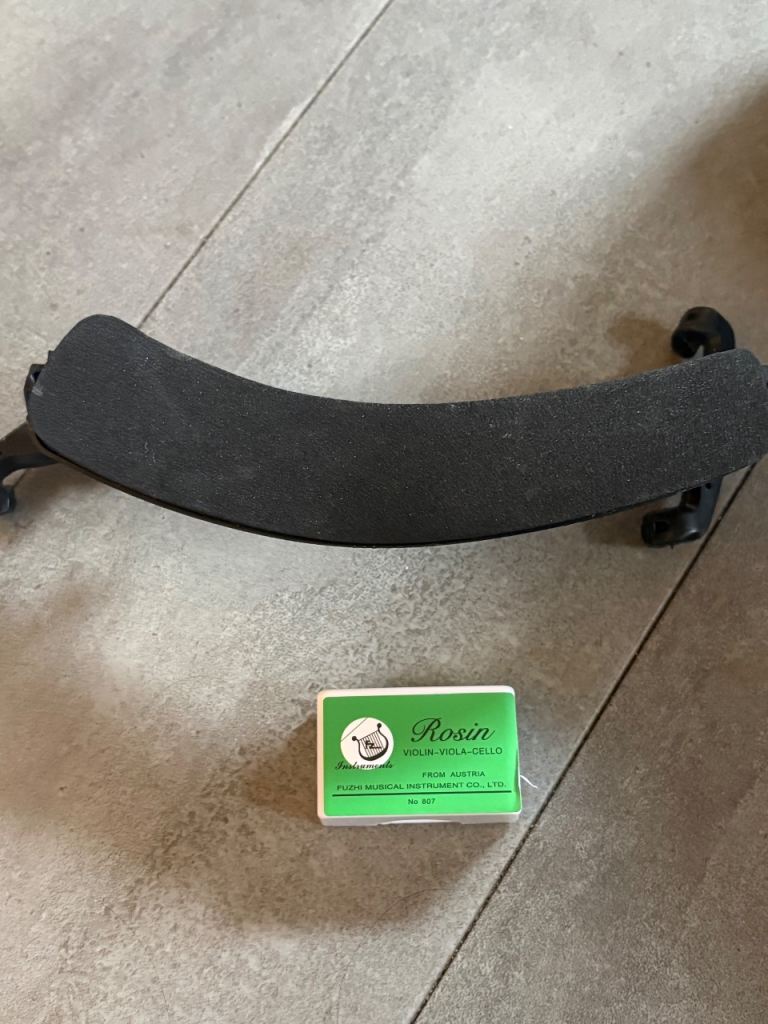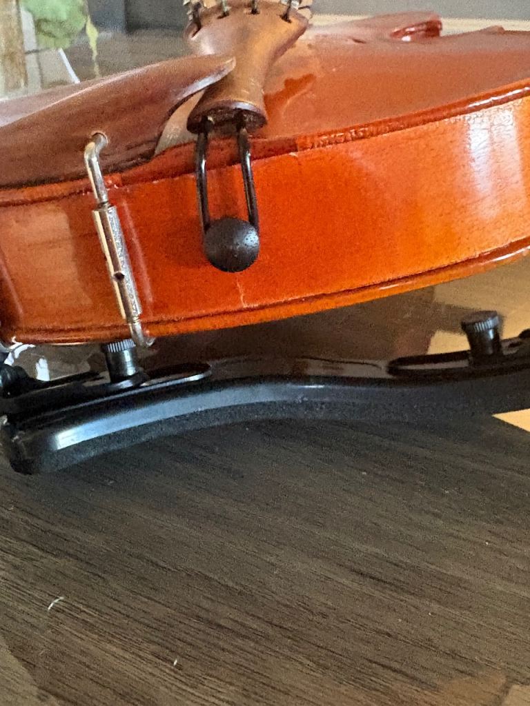 The outfit is completed with a P&H bow, new roisin, an adjustable shoulder rest and an its original vintage hard case with accessory compartment. The handle is missing but still functioning perfectly to store and transport the violin.