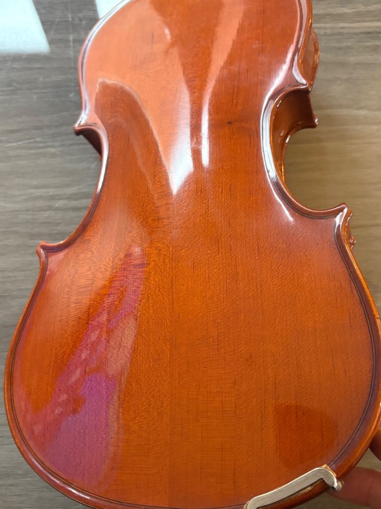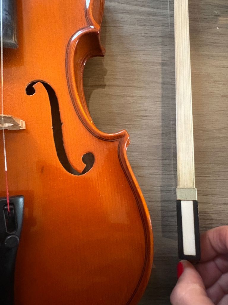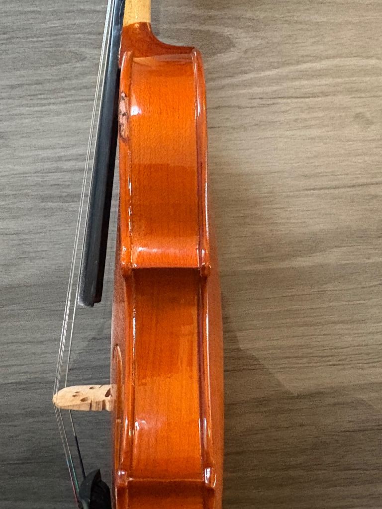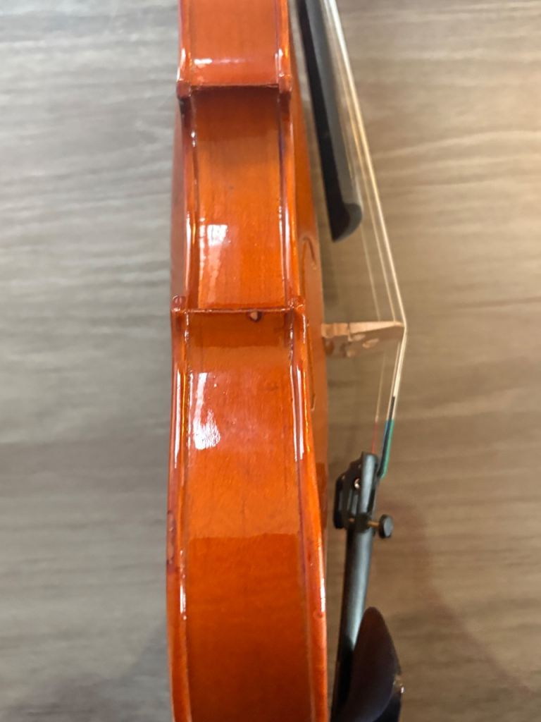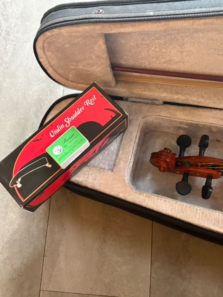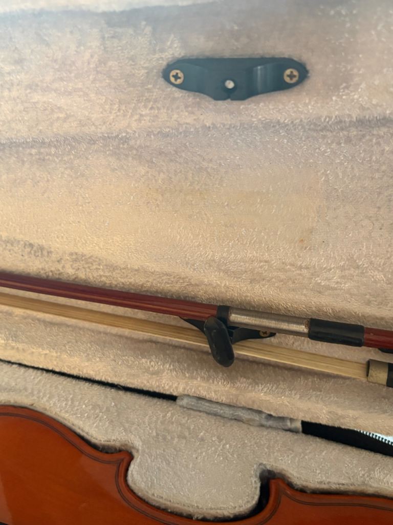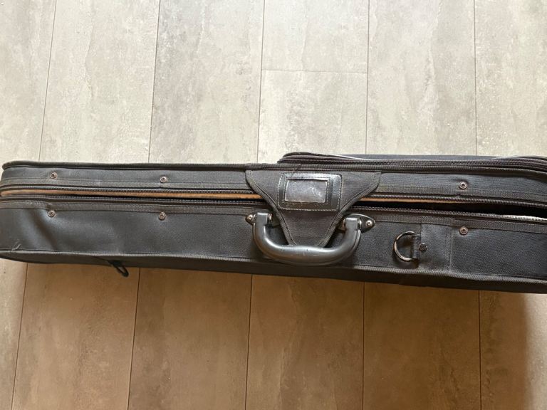 Comes complete with a sturdy bow with half mounted ebony frog bow and a it’s original case (one bow holder has come off), new rosin and a new adjustable shoulder rest.