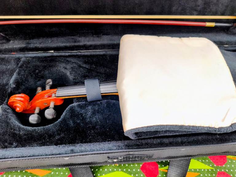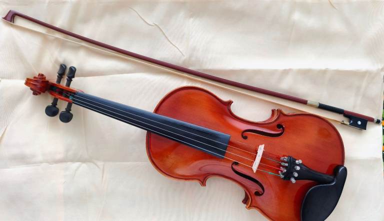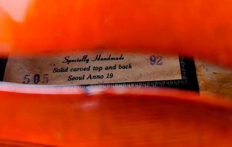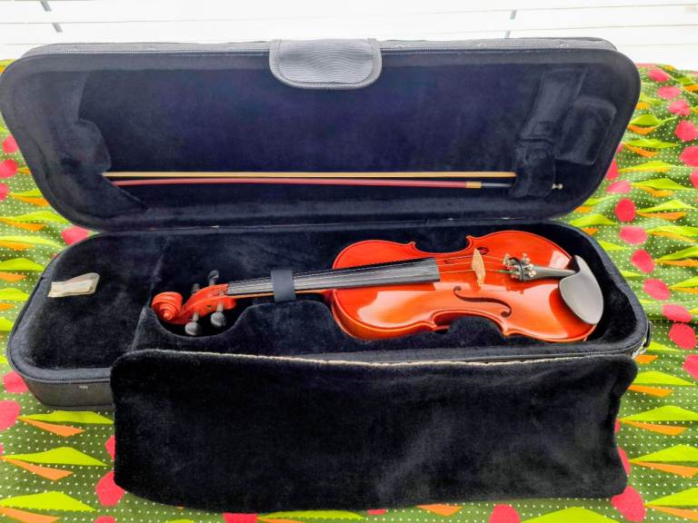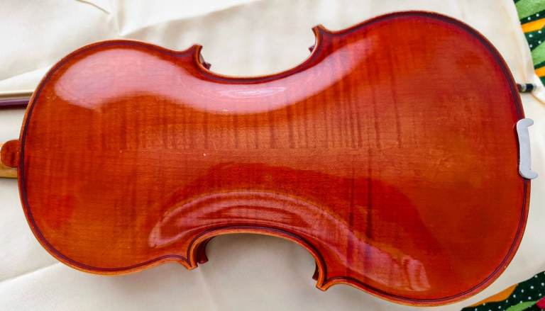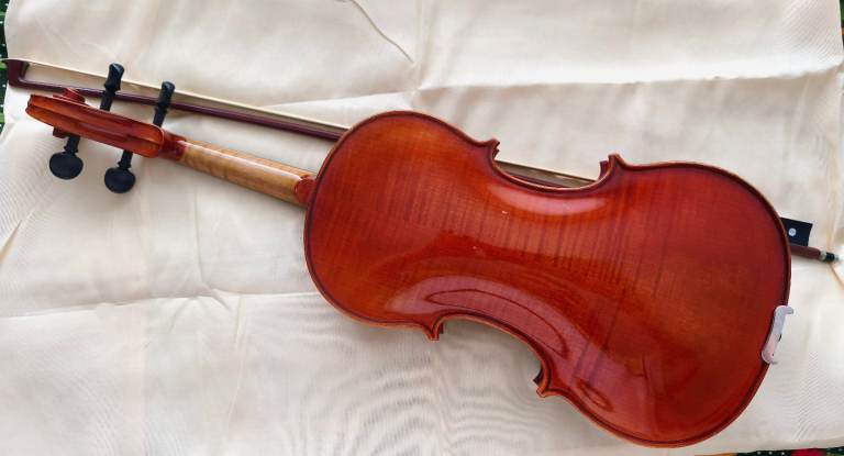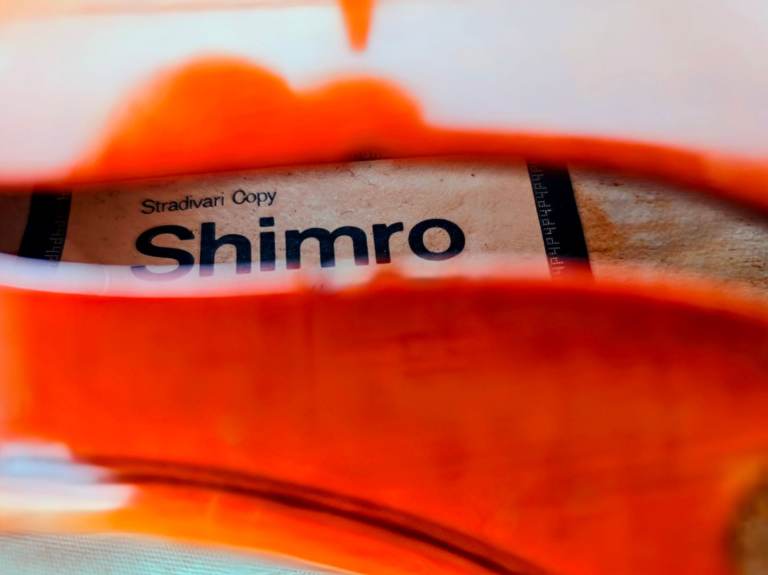 Shimro 505 a handmade "Stradivari Copy" violin, known for solid carved construction and valued for their condition and tone, suitable for beginners and intermediate level violinist.