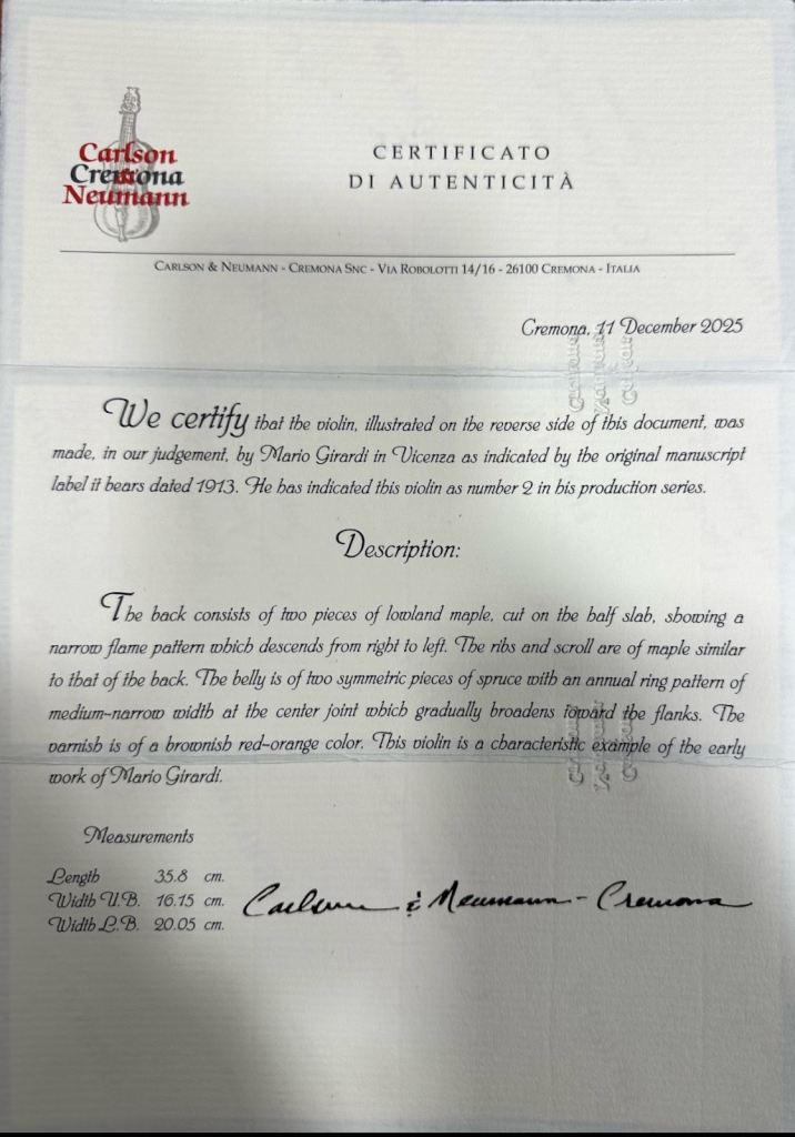 Beautiful fine and rare Italian Violin made by Mario Girardi 1913 with Carson certificate for sale, mint condition no cracks no repairs, only for professional musicians, this is a violin for a live, great investment and great partner for professional talented musician for affordable price!