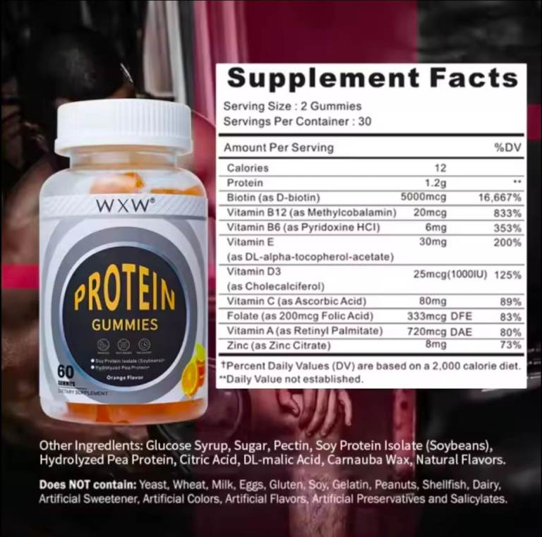 Protein Gummies are bodybuilding supplements designed to be taken before workouts. These orange-flavored gummies are formulated with protein powder as the main active ingredient, making them an ideal choice for gym and training purposes. Suitable for both men and women, this unisex product provides a convenient way to supplement protein intake to support muscle growth and repair after exercise. Whether you're a casual athlete or a serious bodybuilder, Protein Gummies offer a tasty and easy way to enhance your workout routine.