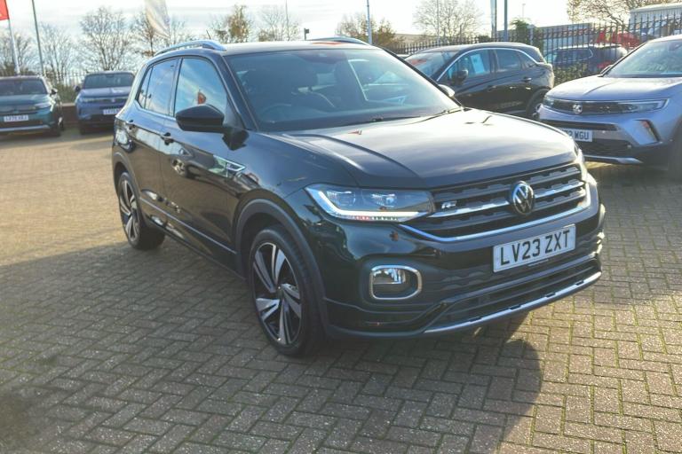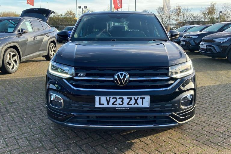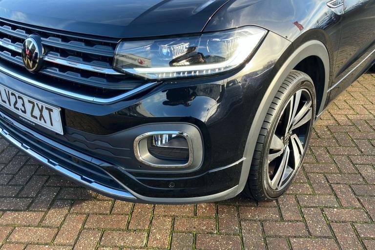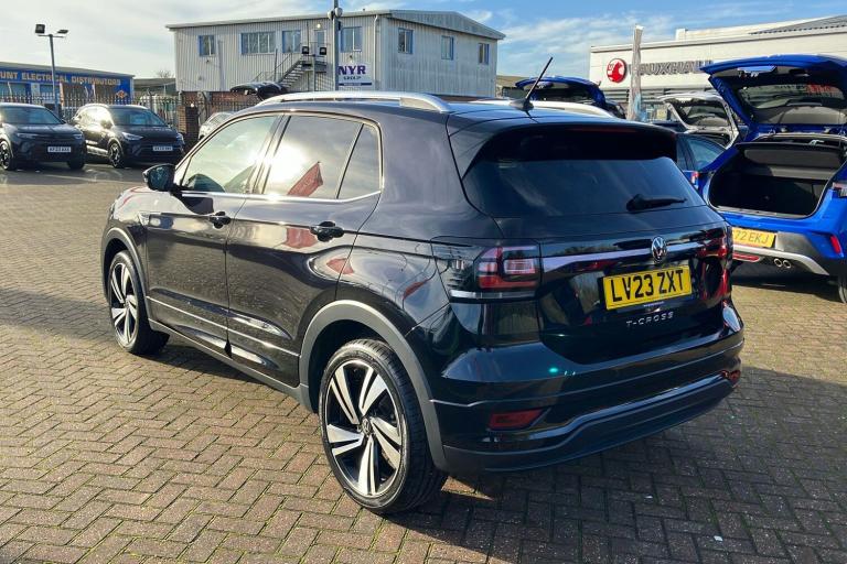 Introducing the Volkswagen T-Cross R Line in striking black first registered in June 2023 and previously owned. This stylish automatic SUV combines an agile 1.0 petrol engine with front wheel drive for easy confident urban and motorway travel. Experience an impressive combined fuel efficiency of 44.1 mpg while enjoying spacious five-seat comfort and a flexible boot offering up to 1281 litres with the seats down. With a maximum speed of 117 mph and the assurance of Euro 6 compliance this T-Cross is eligible to drive in ULEZ areas. The R Line specification brings a distinct and sporty design highlighted by unique styling elements and 18-inch Nevada Black alloy wheels. Practical features like a variable boot floor enhance convenience making this a versatile choice for daily life or longer journeys alike. Experience the perfect blend of refinement comfort and efficiency in this outstanding compact SUV.
