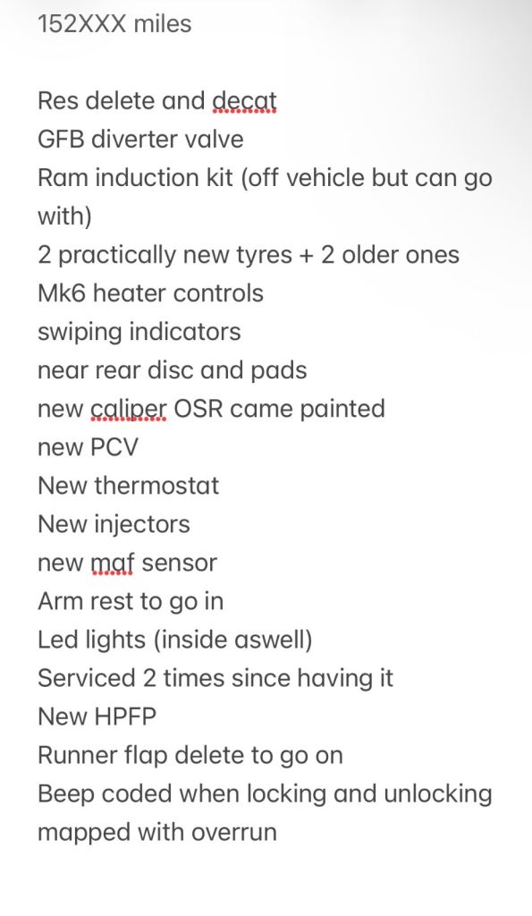 Here for sell is my Mk5 VW golf gti with 155k miles. It is modified with a mix of cosmetic and performance modifications. It has also had general maintenance done to it such as multiple services in my ownership, I have done 2 services with the 3rd one being done soon. It has a decat downpipe fitted with a res delete, it’s loud but when normally driving is quiet which is nice. I have put 2 new cam followers, new pcv, new HPFP, new tyres, new injectors, new rear shocks, new rear drop links, new inner arm on front, mk6 heater controls, cruise control, heated electric lumbar seats, new rear disc and pads, led lights inside and outside, GFB diverter valve, new maf sensor, timing chain kit to be fitted. I have the original cat for the car which is in good condition that can go with it. It has a ram air induction kit on it with ‘stage 1’ map. I have put a spec list in photos. There is no service history with the car but the previous owner had the car for 8 years and looked after it. Headliner was sagging so i stapled it up. Any questions get in touch.