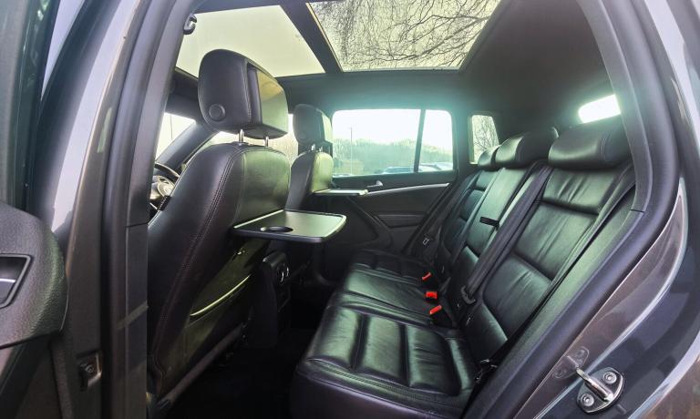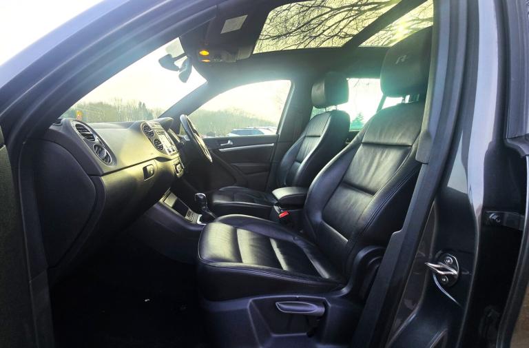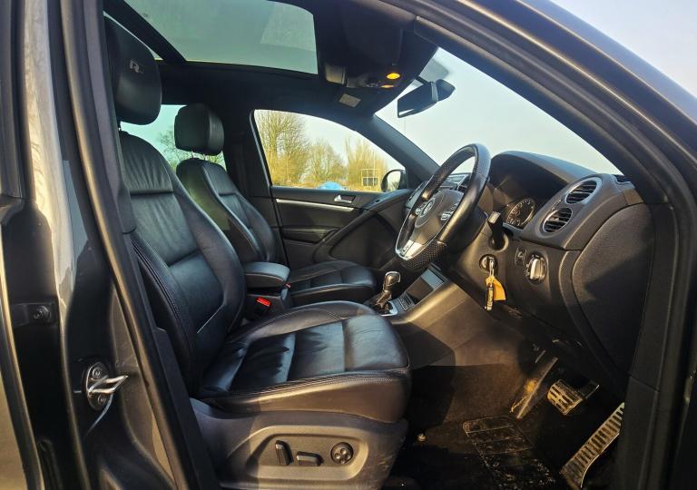 2015 VW TIGUAN 2.0 TDI BLUEMOTION TECH R LINE DSG FINISHED IN DOLPHIN GREY METALLIC + ELECTRIC PANORAMIC TILT AND SLIDE SUNROOF + FULL BLACK LEATHER SPORTS INTERIOR + SAT NAV + REVERSING CAMERA + ON BOARD COMPUTER + DAB RADIO + MEDIA + ELECTRIC FOLDING MIRRORS + FRONT FOGS HEATED FRONT AND REAR WINDSCREEN + HEATED SEATS + CLIMATE CONTROL + FRONT AND REAR PARKING SENSORS + BRUSHED SILVER ROOF RAILS + 18 INCH 5 SPOKE ALLOY WHEELS + 9 MAIN DEALER STAMPS + FSH + MOT UNTIL 20/12/2026 + 2 KEYS + ANY TRIAL/INSPECTION WELCOME + 3,6 AND 12 MONTH WARRANTIES AVAILABLE + NATIONWIDE DELIVERY (Please ask for a quote) + WE ARE FCA REGULATED AND CAN WORK WITH MOST FINANCE COMPANIES (Please have your finance in place before enquiring) ++ £9990 ++ (Whilst every care is taken in providing an accurate description, errors may still occur. Please check details that are important to you before buying. Thank you). 3 rear 3 point seatbelts, Curtain airbags, Driver/Front Passenger airbags, Driver/Passenger whiplash optimised head restraints, Front side airbags, Height adjustable front 3 point seatbelts + pretensioners, Passenger airbag deactivate switch, Seatbelt warning lamp and buzzer, Warning triangle, Alarm with interior protection, Electronic engine immobiliser, Remote central locking with 2 remote folding keys, Anti-lock Brake System + Electronic Brakeforce Distribution + Brake assist, Electronic parking brake with auto hold, Electronic stabilisation programme with electronic differential lock + traction control, Sports suspension, Automatic dimming rear view mirror/rain sensor, Body colour door mirrors with integral indicators, Electric heated + adjustable door mirrors, Front and rear electric windows, Green tinted heat insulating glass, Heat insulated tinted glass from B pillar back, Heated rear window, Rear windscreen washer and wiper with interval delay, Windscreen wipers/ intermittent wipe + 4 position delay, 18"""" front module, Body colour door handles, Body colour roof spoiler, Body coloured bumpers, Chrome roof rails, Chrome side window surrounds, Chrome trimmed front air intake surrounds, Solid paint, Automatic coming home lighting, Bi-xenon headlights/wash + dynamic cornering lights + LED daytime running lights, Cornering front fog lights, Dusk sensor + auto driving lights, 3 rear headrests, 60/40 split folding rear seat, Driver's seat height adjustment, Driver's seat with lumbar adjustment, Foldable front passenger seat backrest, Front seat back storage pockets, Front sports seats, Isofix Preparation 2 Rear child seats, Passenger seat height adjuster, Passenger seat lumbar adjustment, Sliding/reclining rear seats, 'Anthracite-Metallic' interior trim, Silver decorative inserts in door panels, Steel finish air vent surround, Front + rear carpet mats, Front footwell illumination, Front reading lights, Interior light with delay, Luggage compartment lighting, White adjustable panel illumination, Illuminated vanity mirrors, 12V socket in luggage compartment, 3 spoke multi-function leather steering wheel and gearknob, 5 boot load lashing points, Aluminium scuff plates, Drivers underseat storage, Front centre armrest with storage + rear 2 air vents + cupholders, Front cupholders x 2, Front seatback folding tables, Height/reach adjust steering wheel, Kyalami cloth upholstery, Load through provision with 2 cupholders when folded, Lockable cooled glovebox,