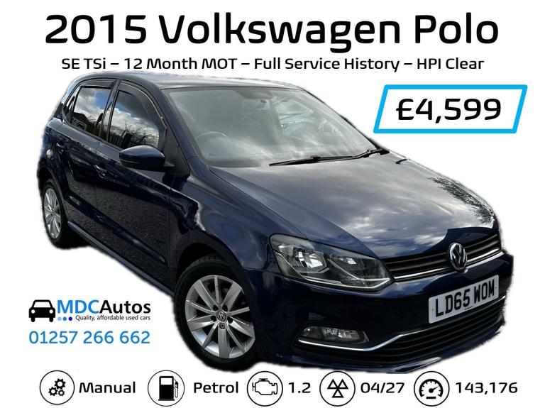 2015 (65) VOLKSWAGEN POLO 1.2 SE TSI 5DR Manual - FULL SERVICE HISTORY - 12 MONTH MOT - HPI CLEAR - 2x KEYS - 12v Socket, Air Conditioning, Bluetooth Preparation (Phone), Cupholders, Front Electric Windows, Height Adjustable Drivers Seat, Pollen Filter, Split Rear Seats, Steering Column - Adjustable, USB and AUX, Cloth Upholstery, Solid Paint, Alloy Wheels, CD Radio, DAB Radio, Leather Steering Wheel, Power Assisted Steering (PAS), Anti Lock Brakes, Driver Airbag, Electric & Heated Door Mirrors, Electronic Brake Assistance (EBA), Electronic Stability Programme (ESP), ISOFIX, Load Area - Load Rings, Passenger Airbag, Traction Control, Alarm, Remote Central Locking - FREE 3 month warranty with every car. Any viewing / inspection welcome, Finance Available - Poor credit specialists, MDC Autos, George Street, Chorley, PR7 2BN