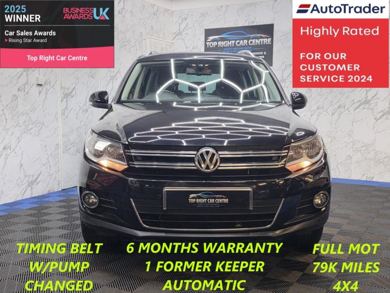 *** NIL DEPOSIT FINANCE AVAILABLE *** 6 MONTHS WARRANTY AND BREAKDOWN COVER WITH THIS CAR.Automatic transmission. 4 wheel drive. Timing belt water pump changed at 51k miles by VW Dealer. 1 former keeper only. 79k miles only.FULL SERVICE HISTORY mostly VW Dealer. FULL MOT on sale. We just done the fresh service.This stunning Volkswagen Tiguan 2.0 TDI has been sourced directly from its Previous Private Owner. Every now and again, a car comes into stock at Top Right Car Centre, that you cannot help but fall in love with.Top Spec BlueMotion Tech Match has massive centre touch screen SATNAV, panoramic and electric sunroof, parking sensors, parking assist, all electric windows, auto folding electric side mirrors, privacy glass, dual climate control, cruise control.Clean Car in Black colour. Great comfortable family car. Well maintained body work and interior. Bullet fast response. Checked by our engineers. Professionally detailed. Good reliable runner. Price checked. We've just completed a full pre delivery inspection on the car to give you complete piece of mind. central locking key. Smooth gear box. Clean Alloy wheels. Excellent condition tyres. Spare wheel. Multimedia has Bluetooth RADIO CD mp3 AUX. Run with no fault strong reliable engine. Good fuel economy. First to see will buy it this well looked after car. cat N. p/x welcome. We do price our cars/van as competitively as possible and because of this we sell cars/vans very quickly. BE QUICK! MISS IT - MISS OUT. With so much variety, quality and highly rated award winner 2024 and 2025, it is no wonder we are super busy all the time. Why Buy From Top Right Car Centre?Thoroughly Inspected Cars. All our vehicles are quality-checked and HPi verified, giving you peace of mind with every purchase.Multi Award-Winning Family Business. As a trusted family-run business, we have earned awards for our customer service and expertise.Hand-Picked, Quality Cars. We carefully select only the finest cars with full service histories, so you can drive away with confidence.Test Driven for Assurance. Each car is personally test-driven by our team, ensuring it meets our high standards.Delivery Service available.