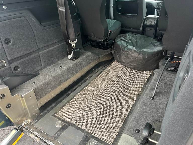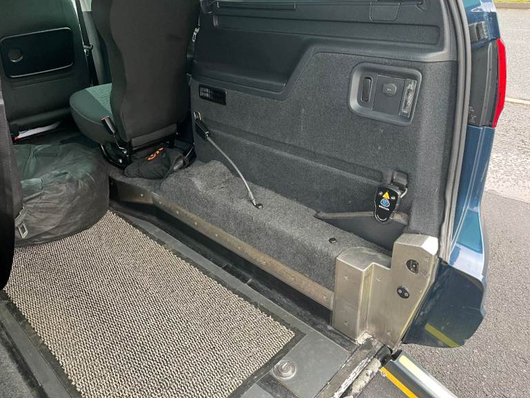 It features 4 seats and a lowered floor to accommodate a power or manual wheelchair. It has a low level ramp, belts/straps to secure the wheelchair and a power winch to help pull the wheelchair into the vehicle.