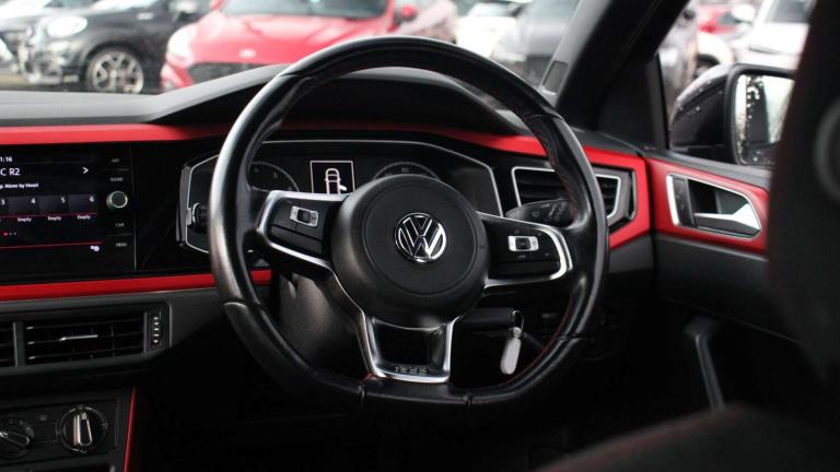.The Volkswagen Polo GTI brings proper hot-hatch attitude into a compact, everyday-friendly package. With its 2.0 TSI engine and DSG gearbox, it delivers the performance punch youd expect from the GTI badge-quick off the line, sharp through corners and effortlessly smooth in traffic. Driving Mode Selection lets you tailor the experience, from calm and economical to full-fat Sport, while the XDS electronic diff lock keeps everything tight and controlled on twisty roads. Visually, it wears its heritage proudly. The black honeycomb grille with chrome surround, GTI badging, gloss-black rear spoiler, twin chrome exhausts and lowered sports suspension make it look every bit the junior Golf GTI. Red brake calipers, darkened LED rear lights and flared sill strips complete the athletic stance. Inside, the Polo GTI mixes iconic touches with modern tech. The flat-bottom multifunction steering wheel with red stitching, aluminium pedals, black roof lining and ambient lighting give it that sporty cockpit feel. Theres space and practicality too: 60/40 split-folding rear seats, plenty of clever storage and three proper rear headrests. The cabin tech is exactly what youd expect from VW: App-Connect, digital display, multifunction computer, illuminated vanity mirrors, LED interior lighting and Volkswagen Connect. Paddle shifters behind the wheel let you take control when the roads get fun. Safety has been taken seriously as well-front, side and curtain airbags, ESP, post-collision braking, Hill Hold, TPMS and an alarm system with interior protection all come as standard. A brilliant blend of performance, style and everyday usability-the Polo GTI is a small car that delivers big smiles every time you press the start button..App-Connect, Digital clock, Driver alert system, Driving Mode Selection with four preset modes - Eco, normal, sport or individual modes, Multifunction computer plus, Power assisted speed sensitive steering, Speedo and rev counter, electronic odometer, trip, service interval display and fuel gauge, Start/stop system, Volkswagen connect, Warning buzzer and light for front seatbelts unfastened, Battery regeneration during braking, Galvanished body, Lowered sports suspension, XDS electronic differential lock, Black grille with chrome surround, Body colour door handles, Body coloured side sills, Electric front windows, Extended sill strips flared in black, Front fog lights including static cornering, Front windscreen washers and wipers with 4 speed