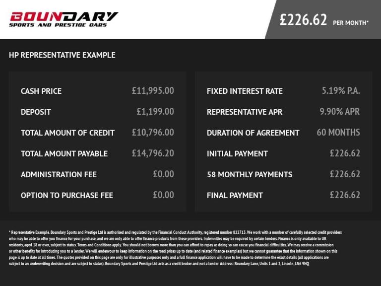 Anti-Lock Brakes (ABS); Passenger Airbag; Side Airbags; Air Conditioning; Alarm; Alloy Wheels; Cruise Control; Electric Windows; Immobiliser; Safety Belt Pretensioners