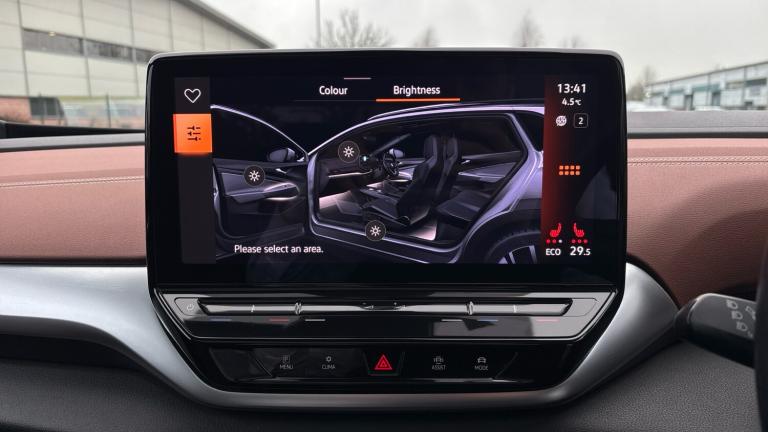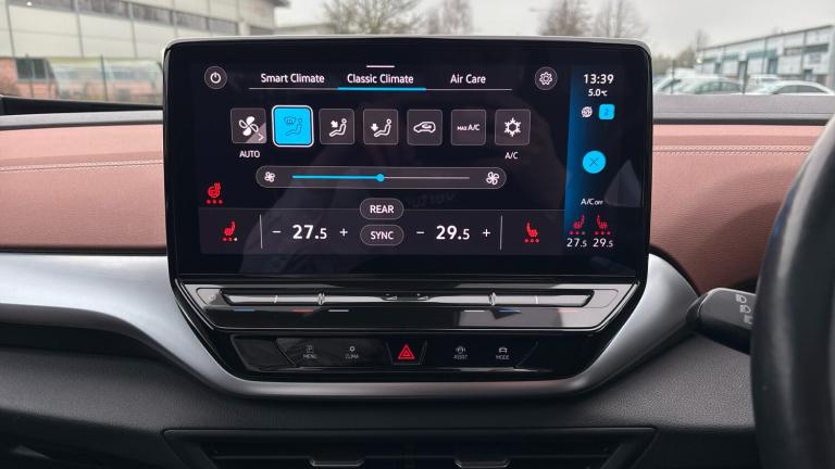 .Front + rear carpet mats, Rain sensor, Heated rear window, Front and rear electric windows, Heated washer nozzles in front, Acoustic glazing rear window and side windows darkened at the rear, Heated clear glass windshield, Laminated safety glass windshield, heated (w/o wires), infrared-reflecting windshield, sound-insulating, Rear wiper, Traction control, Front disc brakes, Electronic parking brake with auto hold, Anti-lock Braking System (ABS), Electronic Stability Programme (ESP), Wireless app connect, We Connect ID app, We Charge Go access, Telephone interface comfort with inductive charging function, Online service, with OCU, with head unit coding, without engine immobilizer interconnection, Driver alert system, Dynamic road sign display, Adaptive cruise control ACC stop and go including speed limiter, Emergency call control unit with eCall, Multifunction camera, Remote tailgate unlocking, Car2X high variant, Trip computer
