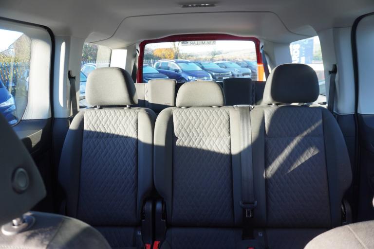 3-point seat belts in front with pretensioner and height adjustment, 3x3 point rear seatbelts, Anti-lock braking system (ABS), Automatic post collision braking system, Autonomous emergency braking front assist with pedestrian and cyclist monitoring, Brake assist, Child locks on rear doors, Curtain airbag for outer seats in rear, Direct tyre pressure monitoring system, Driver and front passenger airbag with front passenger airbag deactivation, Electric parking brake with auto hold function, Electronic brake force distribution, Engine drag torque control, ESP, First aid kit with warning triangle and safety vest, Front centre airbag, Power operated child safety locks, Seat belt reminder, Side and curtain airbag for driver and front passenger, Traction control system (TCS), AppConnect, Bluetooth mobile phone interface, Cruise control + speed limiter, Driver alert system, eCall emergency call system, Front and rear parking sensors, Gesture control, Lane keeping system, Multi function display, On board computer, Service interval indicator, Servotronic speed sensitive power steering, Start/stop system with regenerative braking, Tailgate with window, We connect plus preparation, Anti dazzle rear view mirror, Automatic hazard lights activation under emergency braking, Automatic headlight levelling system, Black roof rails, Body colour bumpers, Dimming breakaway interior rear view mirror, Electric front windows, Electrically adjustable and folding door mirrors, Fixed side window in load/passenger compartment, H7 twin halogen headlamps, Heat insulating windscreen, Heated door mirrors, Heated rear window, LED rear combination lights, Rear window wiper and washer system with intermittent control, Separate daytime running light, Silver sliding door rail, Solid paint, Third high level brake light, Twin near side and off side sliding doors, Windscreen wiper with variable intermittent delay and wash wipe system, 12V socket in passenger compartment, 5 standard interior lights in passenger compartment, Air conditioning - Climatic airconditioning system - manual in cab, Backrest release for front passenger seat, Carpet floor covering in cab, Carpet floor covering in passenger compartment, Centre console high with armrests adjustable, Centre console with 2 cupholders, Door and side trim panel in fabric, Electrically controlled heating system, Folding table on front seat backrests, Front head restraints, Front passenger seat foldable, Height adjustable head restraints, Isofix