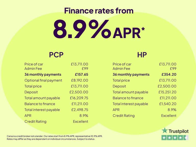 Carsa Ltd is authorised and regulated by the Financial Conduct Authority, FCA Registered Number (FRN) 935130. Carsa Ltd is a Credit Broker not a Lender. Carsa Ltd is an Introducer Appointed Representative of Nukula Limited, which is authorised and regulated by the Financial Conduct Authority, FRN 616475. (VAT No. 356789439). It is our intention to provide a high level of service at all times. However if you have reason to make a complaint about our service (in relation to Insurance Products) you should contact Nukula Limited T/A InsureThat at Sterling House, Sitka Drive, Shrewsbury Business Park, Shrewsbury, SY2 6LG. If we are unable to resolve your complaint satisfactorily, you may be entitled to refer the matter to the Financial Ombudsman Service (FOS). Further information is available by calling the FOS on [Phone number removed] or visit [Website URL removed]. You can check on the FCA's Register by visiting the FCA website [Website URL removed] or by contacting the FCA on 0800 111 6768. Lenders may pay a fixed commission to us for introducing you to them, calculated by reference to the vehicle model, product or amount you borrow. Different lenders may pay different commissions for such introductions. However, any such amounts lenders pay us will not affect the amount if interest you pay under your finance agreement, all of which are set by the lender concerned. Santander Consumer Finance also provide preferential rates to us for the funding of our vehicle stock.