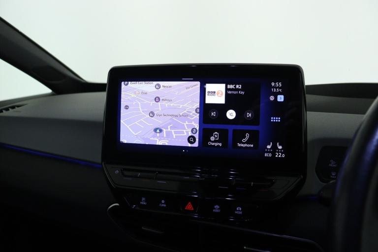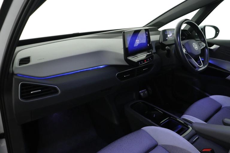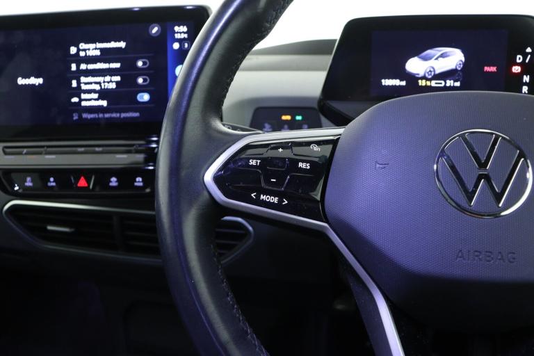 ..10'' touch screen infotainment system, 5.3'' Digital dashboard display, Adaptive cruise control including Front Assist, radar sensor controlled distance monitoring system, City emergency braking system,speed limiter, BLIS (Blind spot information system), Bluetooth connectivity, Car2X technology, Driver alert system, Driver profile selection with personalisation, E-call, Front and rear parking sensors, ID. Light, Lane assist, Natural voice control, Remote tailgate unlocking, Security and service (SOS buttons), Trip computer, Wireless app connect, Exterior e-sound, Mode 3 32-amp / 7.2kW charging cable for charging at public charge points, DAB Digital radio, Touch control, Body colour door handles, Body coloured bumpers, Body coloured door mirrors with intergrated indicators, Front and rear electric windows, Heated rear window, LED 3rd brake lamp, Rear side wing doors, Rear wiper, Separate LED daytime running lights which also perform the indicator function, Variable front intermittent wipers, 3 seat bench in 2nd row, Flow design/Art velour microfleece cloth upholstery, Folding rear seats, Front headrests, Isofix child seat anchor points, Leather steering wheel, Multi-function steering wheel, Pause and play pedals, Pockets and smartphone pockets in seats, Reach + rake adjustable steering column, Rear headrests, Single front passenger seat, Style plus seats, Assistance plus pack - ID.3, Comfort plus pack - ID.3, Design plus pack - ID.3, Infotainment plus pack with wireless smartphone charging - ID.3, Interior style plus pack - ID.3, NCAP pack - ID.3, Sport plus pack - ID.3, 3x3 point rear seat belts, Anti-lock braking system (ABS), Child locks on rear doors, Driver and passenger airbags, Electronic parking brake with auto hold, Electronic Stability Programme (ESP), Front and rear curtain airbags, Front passenger airbag deactivation, Side airbags, Traction control with on/off button, Tyre pressure monitor, Alarm, Immobiliser, Remote central locking, Tool kit, Tyre repair kit