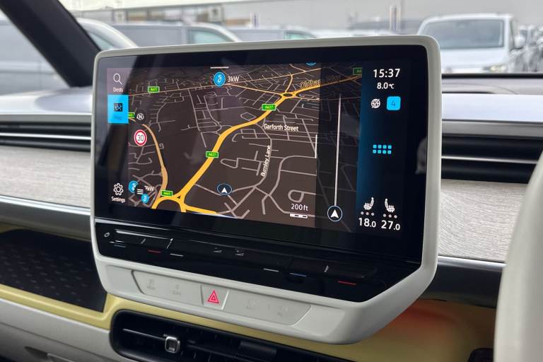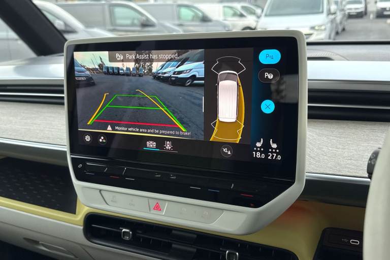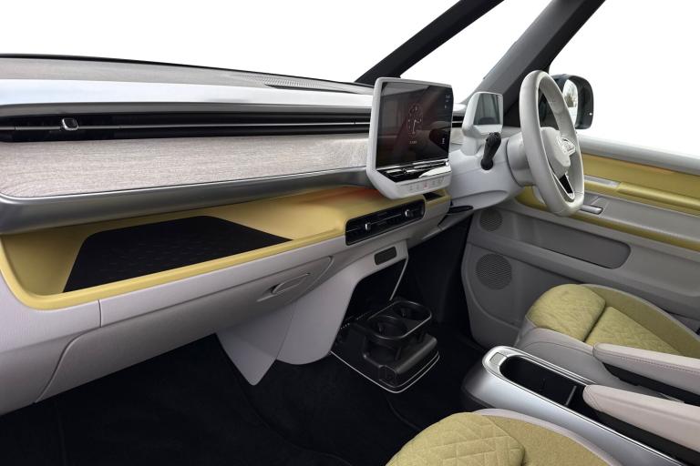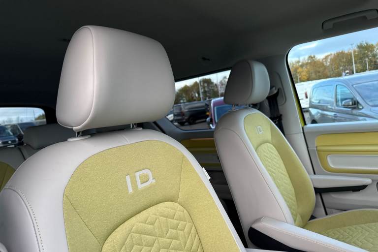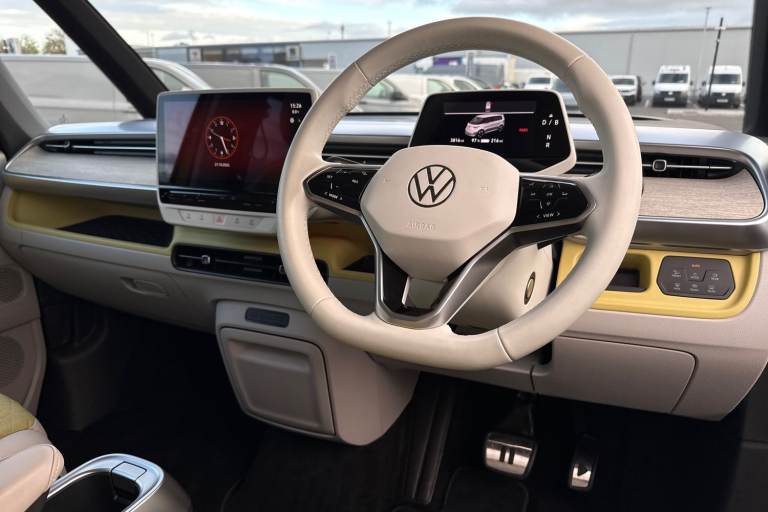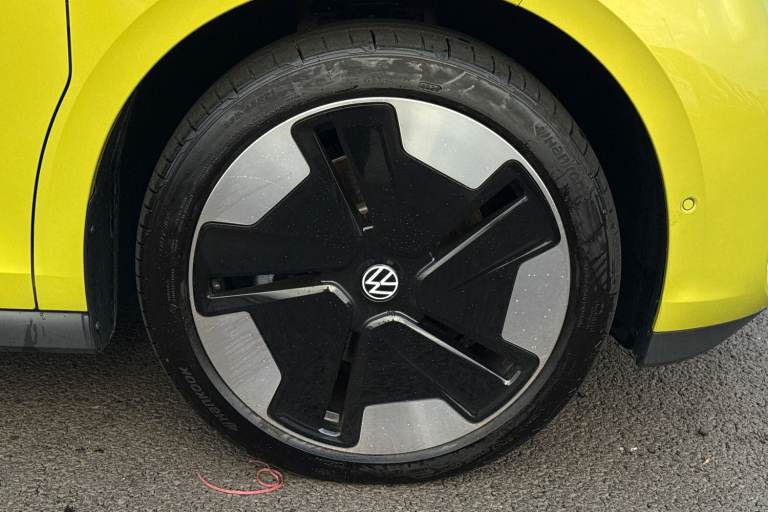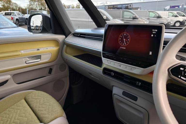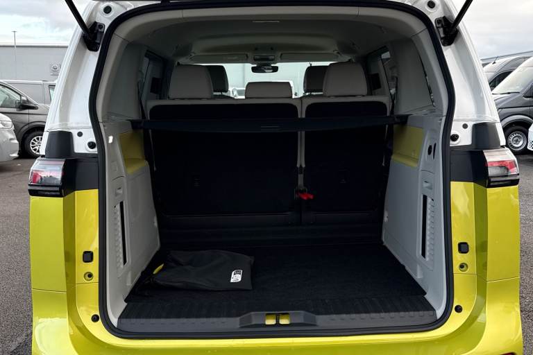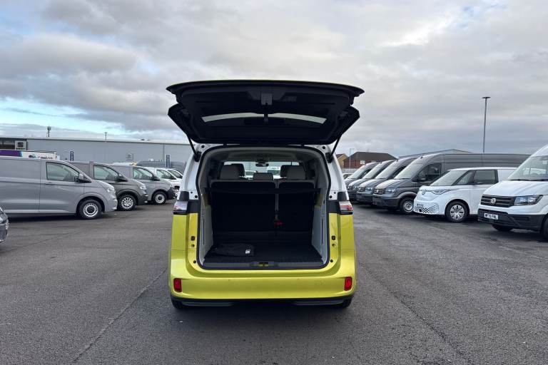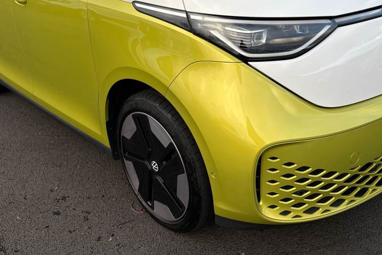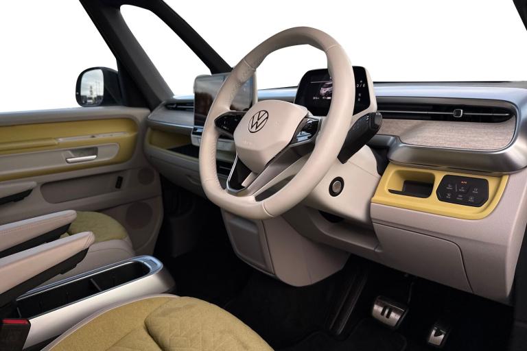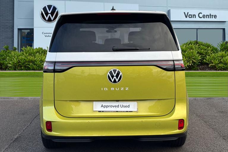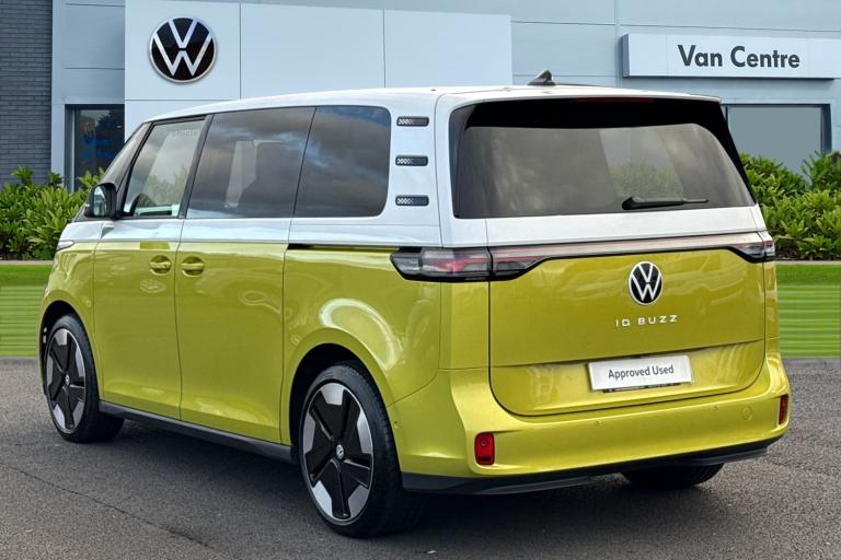 Introducing the striking Volkswagen ID. Buzz 1ST Edition a fully electric, automatic MPV that blends retro charm with cutting-edge technology. Finished in a vibrant Candy White and Lime Yellow two-tone paint, this vehicle stands out with its bold styling and futuristic appeal. The interior complements the exterior with Lime Yellow-Mistral and Soul-Mistral accents, creating a unique and inviting cabin atmosphere. This 1ST Edition model is equipped with 21"" Bromberg bi-colour alloy wheels, complete with anti-theft protection, a tyre mobility kit, and stylish trims. The tyres are specially selected for optimal performance and comfort, with HL 235/45 R21 at the front and 265/40 R21 at the rear. Inside, youll find a host of premium features including heated front seats, a heated multifunction steering wheel with touch controls, and a removable Buzz Box centre console for added practicality. The Comfort Seat Package adds power-adjustable front seats with memory function, lumbar support, and adaptive ambient lighting with 30 colour options. Technology is at the heart of the ID. Buzz, featuring the Discover Pro navigation system with a 12"" colour touchscreen, voice control, wireless phone charging, and a 9-speaker audio setup. The Infotainment Package Plus ensures seamless connectivity and entertainment on every journey. Safety and convenience are enhanced with the Assistance Package Basic, which includes Adaptive Cruise Control with stop & go, Park Assist Plus with Park Dista...