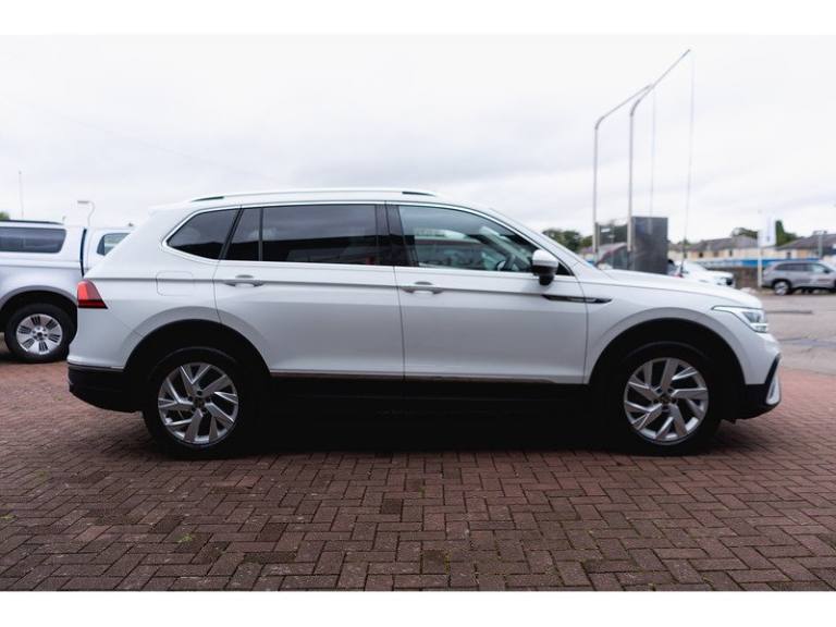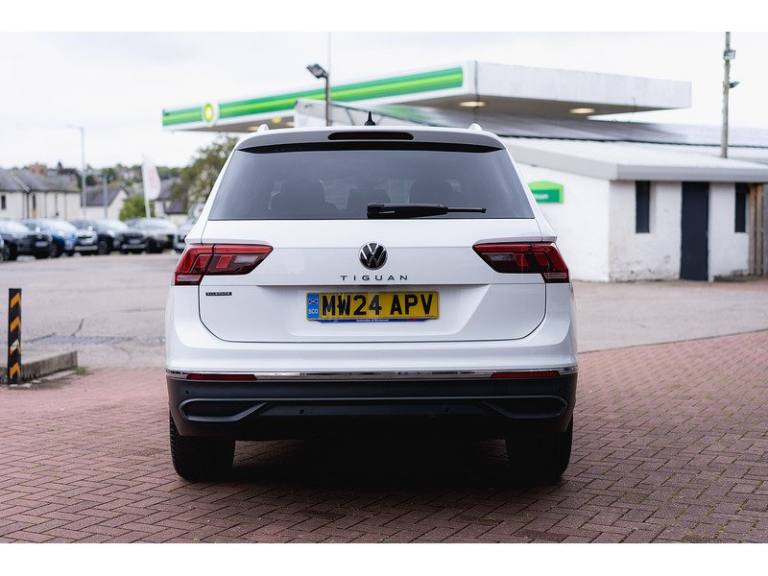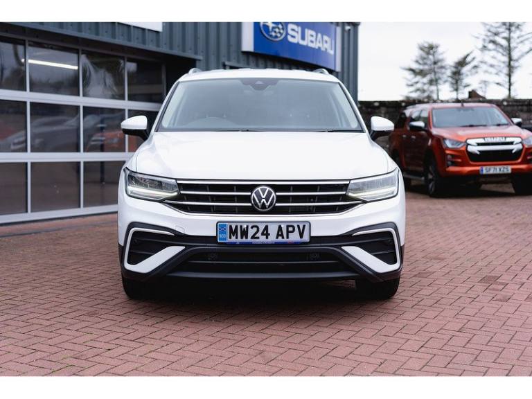 Decorative inserts ""Checker Flag Titanium"",Pure White Non-Metallic,1498 cc in-line 4 engine,10.30 inch 26.2cm multi-function display screen(s) located on instrument panel fixed 8.00 inch 20.3cm touch sensitive multi-function display screen(s) located on dashboard Dashboard centre 1,10.30 inch 26.2cm multi-function display screen(s) located on instrument panel fixed 8.00 inch 20.3cm touch sensitive multi-function display screen(s) located on dashboard instrument cluster 1,12v power outlet located in boot/cargo section front section and rear section boot/cargo,12v power outlet located in boot/cargo section front section and rear section front,12v power outlet located in boot/cargo section front section and rear section rear,36 months remote services includes theft alert remote lock/unlock find my car beep/flash speed alert send destination to car vehicle diagnostics and driving history & analysis,40/20/40 split folding rear seats: split bench type with space for three people; with zero electric adjustments and ski hatch front,58 litre 12.8 UK gallon main fuel tank main,80 watt audio player with touch screen ; radio receives FM digital internet and RDS,ABS,Adaptive cruise control,Alloy look trim on dashboard and leather gearknob,Anti collision system which activates brake lights and brakes at low speed includes brake assist driver monitor visual/acoustic warning and pedestrian & cyclist avoidance system operates above 50 kph/30 mph and operates below 50 kph/30 mph,Anticorrosion warranty: 144 months 9999999 miles 9999999 km,Anti-theft protection with interior monitoring,Apps control,Automatic air conditioning with three climate control zones,Automatic hazard lights,Bluetooth,Brake assist system,Central door locking: Operated by mobile phone (NFC) Includes windows,Centre armrest between front seats,Centre armrest between rear seats,Charges: VAT [20%] = 6170.00 VED (Standard Rate) = 180.00 FRF = 55.00 VED (First Year 151 - 170 g/km) = 645.00 Additional Charges (GB) = 0.00,Chrome/bright trim around side windows on side of body and on bumpers,Chrome/silver roof rails,Computer includes average fuel consumption,Connections for USB (front) x2 x0 x0,Cup holders for front seats and rear seats front seats,Cup holders for front seats and rear seats rear seats,Cylinder shutdown,Data completeness: up to date pricing data up to date data for key leasing items specifications data from official documentation up to date colour & trim data up to date option pricing data and up to date option content data,Date introduced: Model introduced 22 Jul 2021 and Version introduced 22 Jul 2021,Day time running lights,Door sill protector alloy,Drivers airbag passengers airbag with de-activation switch driver,Drivers airbag passengers airbag with de-activation switch passenger,Driver seat: individual type with seat back table passenger seat: individual type folding with seat back table driver,Driver seat: individual type with seat back table passenger seat: individual type folding with seat back table passenger,DSG transmission: 7-speed dual clutch sequential featuring control mounted on the floor,Dual clutch sequential gearbox,Dynamic steering,Eight speakers,Electrical system 12,Electric boot/hatch pull down,Electronic hand brake,Electronic traction control,Embedded infotainment user interface with 36 months of online services,Emergency call,Emissions: EU6 D compliant,Energy recuperation from regenerative braking,Engine start/stop,Exterior door handles,External dimensions: 4728mm long 1839mm wide 1686mm high 2788mm wheelbase 1575mm front track 1565mm rear track 11910mm turning circle (wall to wall) 186.1 inches long 72.4 inches wide 66.4 inches high 109.8 inch wheelbase 62.0 inch front track 61.6 inch rear track 2099 39.1 and 82.6,Five door sports utility vehicle ; Platform code: MQB Right hand drive,Fixed delivery charges: 825.00 687.50 (excluding VAT) fuel included 0 litres includes number plates,Floor mats,Four disc brakes including two ventilate.This 2024 Volkswagen Tiguan Allspace TSI Life boasts an exceptional full VW service history, ensuring its excellent condition. This versatile 7 seater is powered by a 1.5 litre petrol engine, meeting Euro 6 emissions standards. Notable features include Park Distance Control for both front and rear, complemented by a multifunction front facing camera for enhanced parking assistance. Enjoy the convenience of wireless phone charging through the mobile phone interface and maintain a comfortable distance on journeys with Adaptive Cruise Control, which includes a radar sensor controlled distance monitoring system.The Tiguan Allspace TSI Life offers a compelling blend of practicality and technology. Its acceleration from 0 to 62mph in just 9.6 seconds demonstrates its responsive performance. The generous boot space provides ample room for luggage or shopping, making it ideal for families or those who need extra capacity. These features, combined with its low mileage and comprehensive service history,