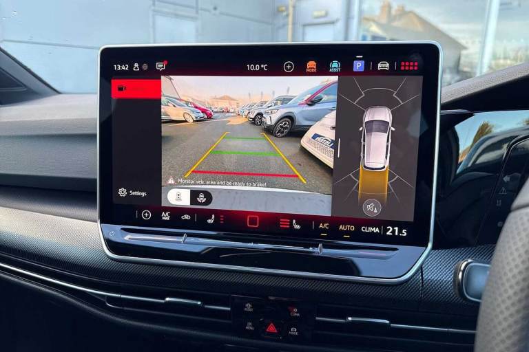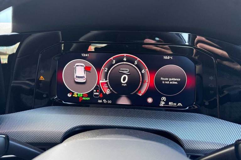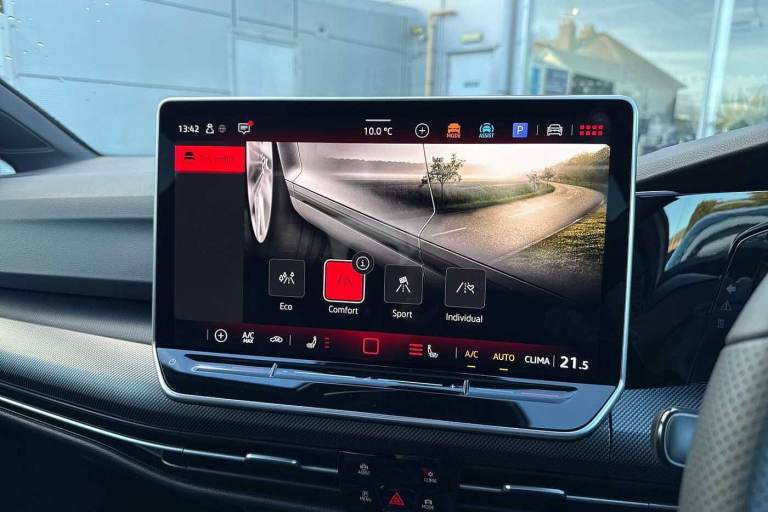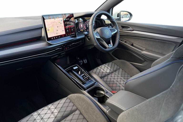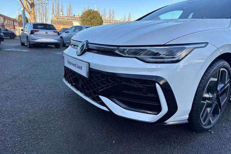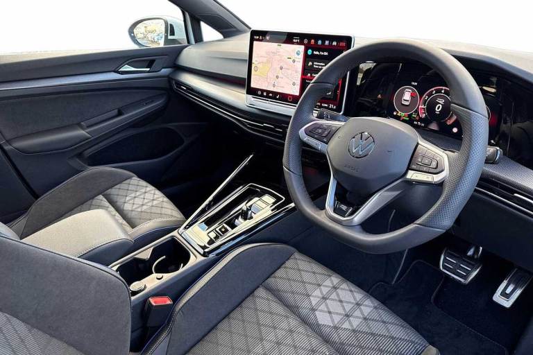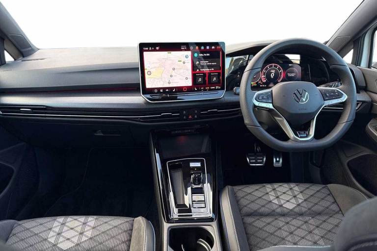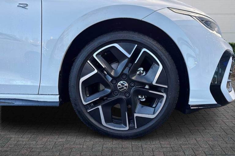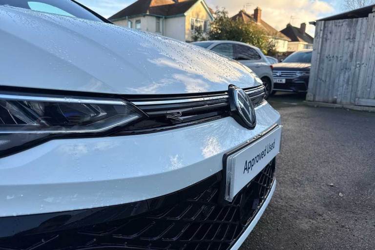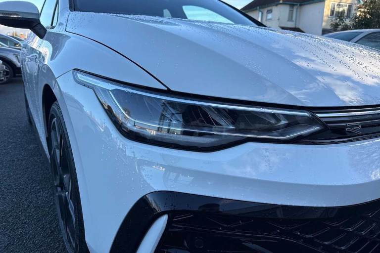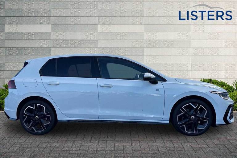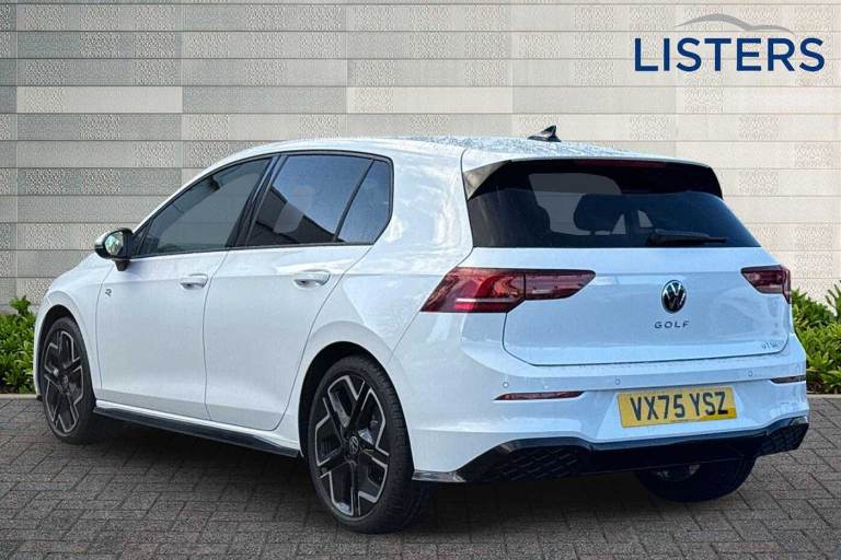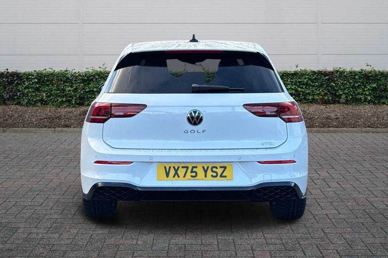 Available from 03/03/2026. Volkswagen Golf Hatchback 1.5 eTSI 150 R-Line 5dr DSG in Pure White. Specification Includes Safety,Front and rear parking sensors,Interior Features,Leather wrapped multifunction sports heated steering wheel with touch control and paddle shift,Tilting and sliding panoramic sunroof with 2X front and 2X rear LED reading lights,Wheels,18in York alloy wheels with diamond turned surface,Packs,Winter package - Golf DSG Estate/Hatchback,Exterior Features,Front and rear electric windows,Heat insulating windshield made of laminated glass,Rear windscreen washer and wiper with interval delay,Body colored bumpers in R-Line style,Body colour door handles,Rear exhaust tailpipe,Rear side wing doors,3rd brake light,Automatic headlamp activation with Coming home and Leaving home feature,LED separate daytime running light,Rear fog light on one side and reversing lights on both sides,Welcome light with surround lighting,Safety,ABS,Autonomous emergency braking front assist with pedestrian and cyclist monitoring,Electronic parking brake with auto hold,ESC (Electronic Stability Control),Hill start assist,Rear disc brakes,Volkswagen roadside assistance,Activated carbon canister,Adaptive cruise control (ACC),Advanced driver attention and drowsiness monitor,Dynamic road sign display,Dynamic steering,Multifunction front facing camera for distance control,Oncoming vehicle braking when turning including swerve support,Speed limiter,Exterior mirrors convex on the left and aspherical on the right,Remote electrically foldable door mirrors- puddle lights and reverse activated passenger's door mirror,3 point height adj front seatbelts + pretensioners,3 rear three point seatbelts,Child locks on rear doors,Driver and front passenger airbag with front passenger airbag deactivation,Extended pedestrian protection measures,Two tone horn,Tyre pressure loss indicator,Interior Features,Front + rear black carpet mats,12V socket in front centre console,12V socket in luggage compartment,Black roof lining,Brushed stainless steel pedals,Chrome plated radiator grille inserts- air vent surrounds and light switch surrounds,Door insert- side trim panel and arm support in leatherette,Front centre armrest,Plastic gear knob,Rear cupholder and loadthough,Sardegna cloth upholstery with front and outer rear seats Art Velour inner sides of bolsters,Titanium black instrument panel,Ambient lighting with 30 colour including LED light unit in front footwell with selectable light