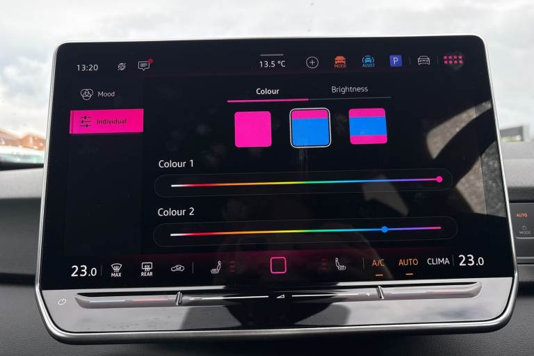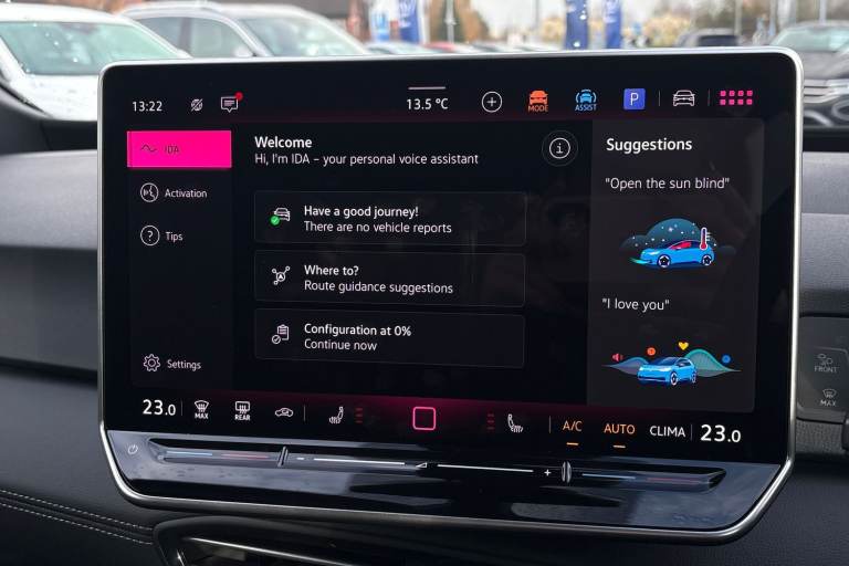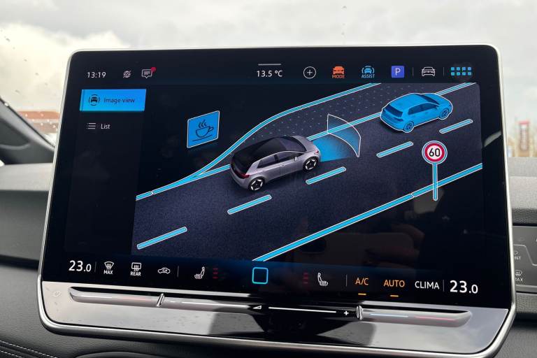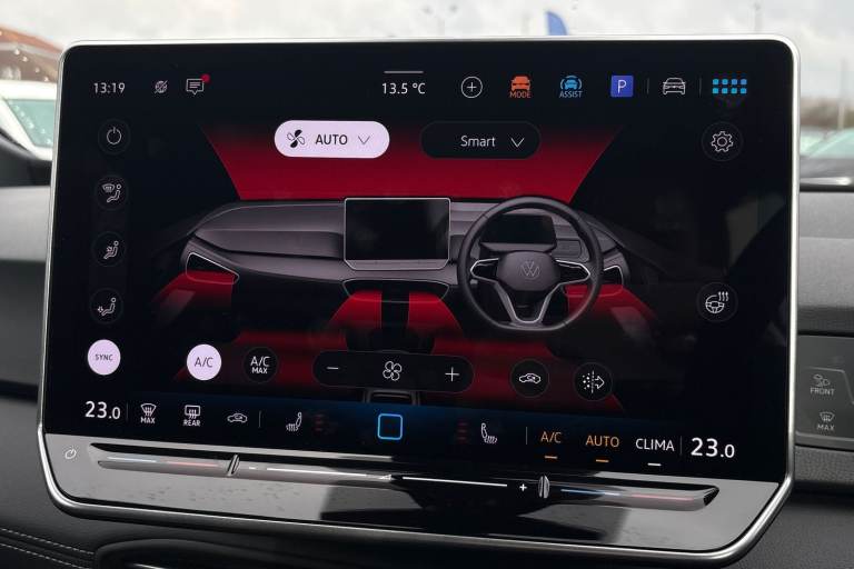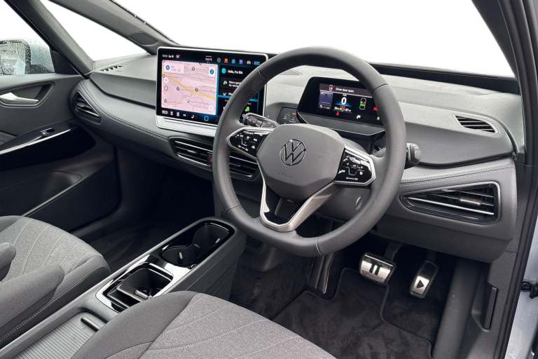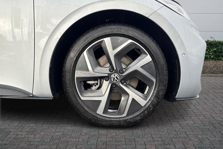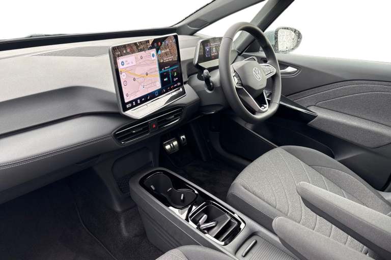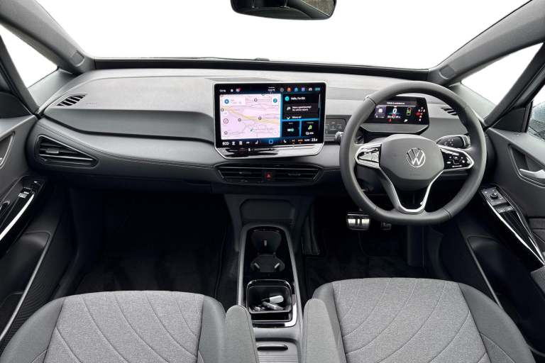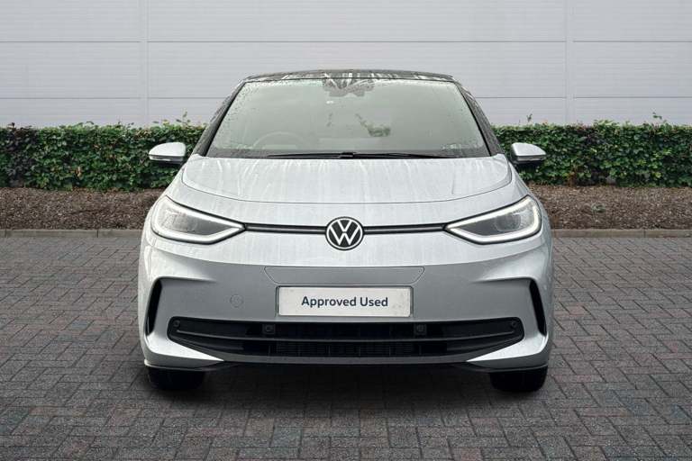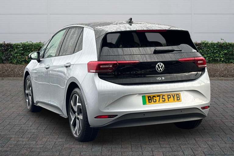 Available from 03/02/2026. Volkswagen ID.3 Hatchback 150kW Match Pro 59kWh 5dr Auto in Scale Silver. Specification Includes Exterior Features,Metallic paint,Vehicle Charging,Mode 2 (3-pin) mains charging cable,Wheels,19in Wellington black diamond turned surface alloy wheels,Paint - Metallic,Metallic - Scale silver/Solid black roof,Trim - Cloth,Taia cloth - Grey melange,Exterior Features,Automatically front heated washer nozzles,Front and rear electric windows,Heat insulating windscreen,Heated windscreen washer jets,Rain sensor,Rear tinted glass from B-pillar backwards approx 65% tinted,Rear wiper,Variable front intermittent wipers,Body colour door handles,Body coloured bumpers,Rear side wing doors,Advanced dynamic light assist for LED matrix headlights,Automatic headlights,LED 3rd brake lamp,Separate LED daytime running lights which also perform the indicator function,Welcome light,Safety,Anti-lock braking system (ABS),Autonomous emergency braking front assist with pedestrian and cyclist monitoring,Disc brakes in front,Electronic parking brake with auto hold,Electronic Stability Programme (ESP),Traction control with on/off button,Adaptive cruise control,Advanced driver attention and drowsiness monitor,Dynamic road sign display,Lane assist,Oncoming vehicle braking when turning including swerve support,Auto dimming rear view mirror,Remote electrically foldable door mirrors- puddle lights and reverse activated passenger's door mirror,3 rear 3 point seatbelts,Centre airbag,Child locks on rear doors,Driver and front passenger airbags,Front and rear curtain airbags,Front passenger airbag deactivation,Front side airbags,Single tone horn,Tyre pressure loss indicator,Audio / Communications,Bluetooth connectivity,Car2X intelligent vehicle networking,E-call,E-Sim card for online connectivity,Natural voice control,Wireless app connect,Wireless Smartphone charger,2 USB C ports in front- 2 USB charging sockets on the centre console in the rear charging capacity upto 45W,DAB Digital radio,Front speakers,Gaming platform via car app,Miscellaneous,Discover pro navigation with 12.9in screen,Preparation for navigation system with media and internet package,Trip computer,Warning signal and warning light for front and rear seatbelts not fastened,Battery 320 A (49 Ah),Standard electronic engine sound actuator,Interior Features,Air Care climatronic 2 zone air conditioning,Electric auxiliary air heater,Centre console with illuminated storage compartment with sliding cover and two