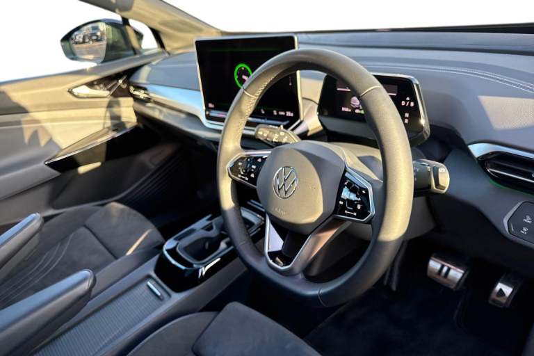 Silent, powerful, and unapologetically sleek, the Volkswagen ID.4 210kW Black Edition Pro 77kWh redefines what modern electric driving should feel like. Finished in rich Grenadilla Black Metallic, its smooth, aerodynamic silhouette is sharpened by the Black Style packagehigh-gloss black exterior accents, black mirror housings, and bold 19"" Onyx black alloy wheels give the ID.4 a stealth-inspired presence. Subtle exterior ambient lighting in the door handles and grille, paired with the illuminated light strip between the headlamps, ensures it commands attention long after the sun goes down. Open the door and the Soul Black interior sets a refined, contemporary tone. The Plus interior package elevates comfort with premium ArtVelours microfleece sports seats, fully power-adjustable with memory, seat depth adjustment, lumbar support, and soothing massage functions. Heated front seats and a heated leatherette multifunction steering wheel make every drive feel indulgent, while the panoramic glass roof floods the cabin with natural light, adding a sense of space and calm. Ambient lighting with 30 selectable colours and ID.Light transforms the interior into a personalised digital lounge, subtly communicating vehicle information through light while enhancing the atmosphere. Practicality is equally well considered, with a versatile rear seat layout, illuminated centre console storage, and multiple high-power USB-C ports front and rear to keep devices charged on longer journeys. Tec...