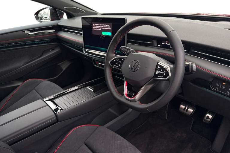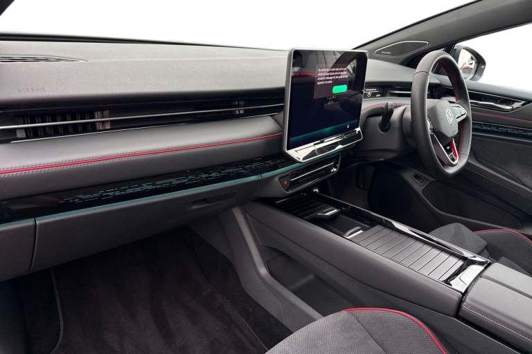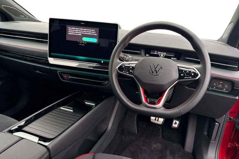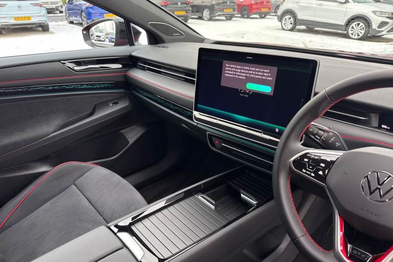Step into the future of performance motoring with this Volkswagen ID.7 GTX Plus 250kW 4MOTION, a flagship all-electric fastback that blends breathtaking power with cutting-edge luxury. Finished in premium black paint, its sleek, aerodynamic silhouette is complemented by the confidence of dual-motor all-wheel drive and a substantial 86kWh battery, delivering exhilarating acceleration with effortless long-distance capability. The interior is unmistakably GTX. A striking Soul Black and Red cabin sets a sporty yet sophisticated tone, enhanced by the Interior Pack Plus. Sink into power-adjustable comfort seats trimmed in ArtVelours eco microfleece, complete with heating, ventilation and massage functions for the front, plus heated rear seats for passengers. Memory settings, adjustable lumbar support and thoughtful storage solutions make every journey as relaxing as it is refined. Technology takes centre stage with the Discover Pro navigation system and an outstanding Harman Kardon sound system, delivering a rich, immersive audio experience through 12 speakers and a 700W amplifier. The heated multifunction steering wheel, intuitive touch controls and premium cabin materials reinforce the ID.7s modern, high-end feel. Comfort extends beyond the cabin thanks to the 3-zone Air Care Climatronic system, allowing individual temperature control for front and rear occupants, while the energy-efficient heat pump maximises range and efficiency in colder conditions. An electric tailgate ad...