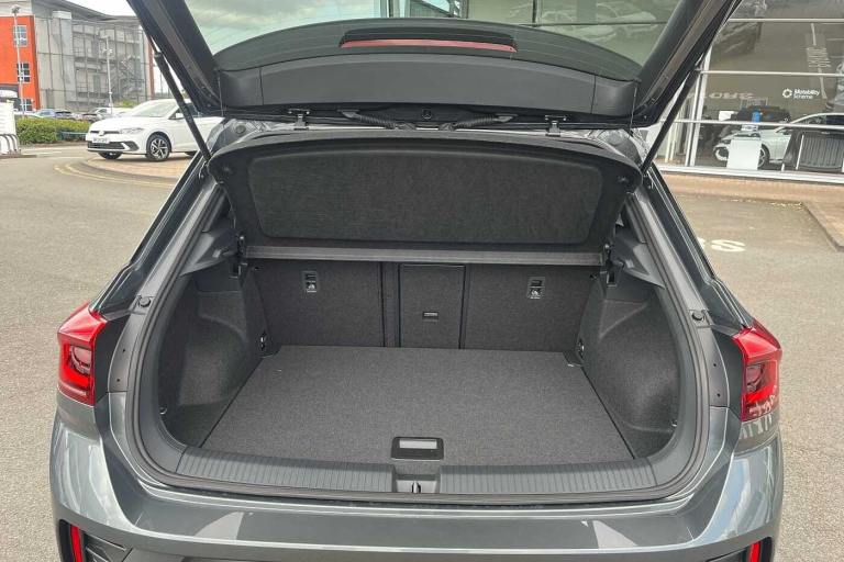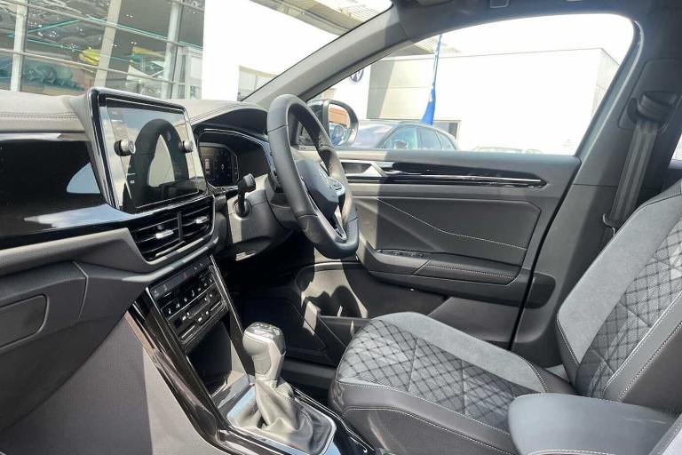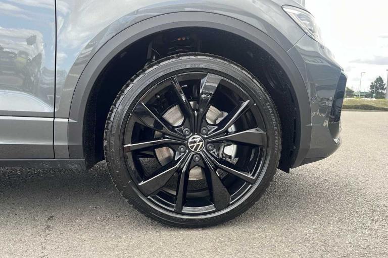Available from 30/09/2025. Volkswagen T-Roc Hatchback 1.5 TSI Black Edition 5dr DSG in Indium Grey With Black Roof. Specification Includes Exterior Features,Two tone metallic paint,Safety,Rear view camera,Wheels,19in Misano black diamond turned alloy wheels with low rolling resistance and anti theft wheel bolts,Paint - Metallic,Metallic - Indium grey with black roof,Exterior Features,Front windscreen wiper with intermittent wipe and 4 position delay,Heated rear window,Power windows with comfort operation and circuit breaker,Rain sensor,Rear wash/wipe with intermittent wipe setting,Rear shock absorption chassis with increased ride height,Extended roof spoiler,External USB type C socket and charging sockets,Illuminated front grille,R-Line design body coloured bumpers,Rear exhaust tailpipe,Rear side wing doors,Automatic hazard lights activation under emergency braking,Automatic headlight control with LED separate daytime running lights with coming/leaving home function,Dynamic cornering light,IQ LED matrix headlights,LED 3rd brake light,LED rear number plate lights,LED rear tail lights with dynamic turn signal,Light mode for poor weather- rain- fog or snow,Rear fog light on one side and reversing lights on both sides,Safety,ABS,City emergency braking and pedestrian monitoring,Electronic parking brake,Electronic Stability Control (ESC) inc EDL (Electronic Differential Lock) and ASR (Traction Control),Front disc brakes,Hill start assist,Rear disc brakes,Volkswagen roadside assistance,Advanced driver attention and drowsiness monitor,Lane keeping system Lane Assist,Modified key software - reduce switch off time for key status change to Long no motion,Park assist including front and rear parking sensors,Power assisted speed sensitive steering,Auto dimming interior rear view mirror,Electrically adjustable and heated door mirrors,Exterior mirrors aspherical on driver side- convex on front passenger side,Remote electrically foldable door mirrors- puddle lights and reverse activated passenger's door mirror,3 point height adj front seatbelts + pretensioners,3 point seatbelts in outer rear with ECE label,Child locks on rear doors,Driver and front passenger airbag with front passenger airbag deactivation,Driver and front passenger safety-optimised head restraints,Drivers seatbelt reminder,Front and rear passengers curtain airbag system including front side airbags,Predictive pedestrian protection,Two tone horn,Tyre pressure loss indicator,Interior Features,Front + rear