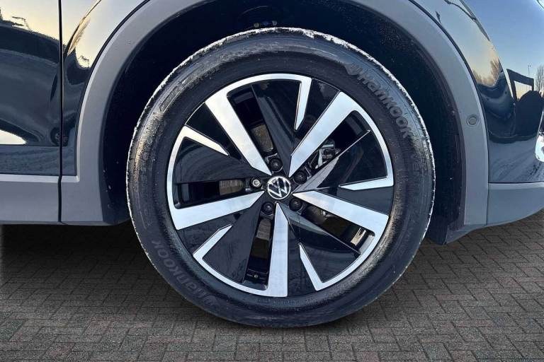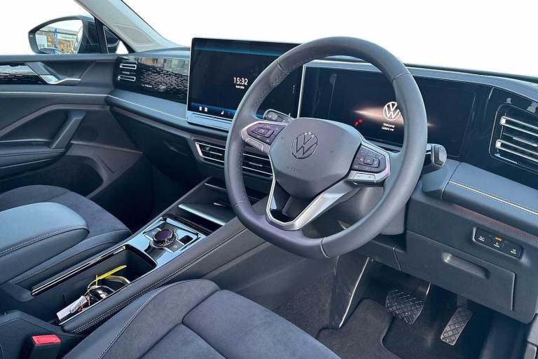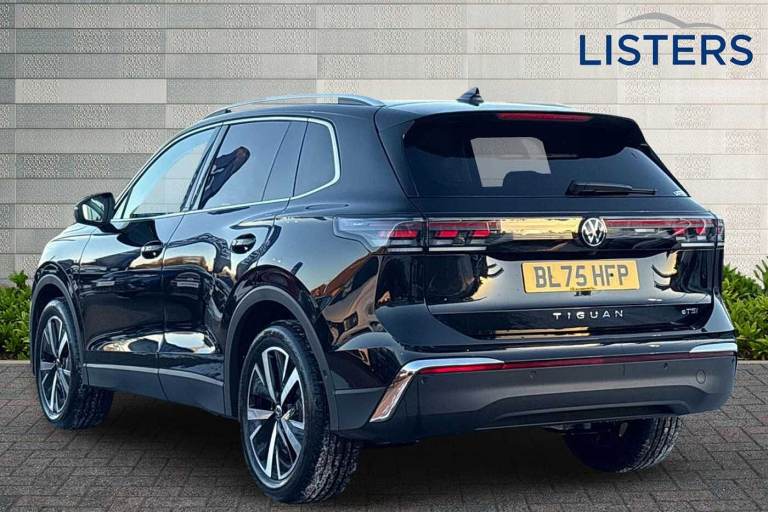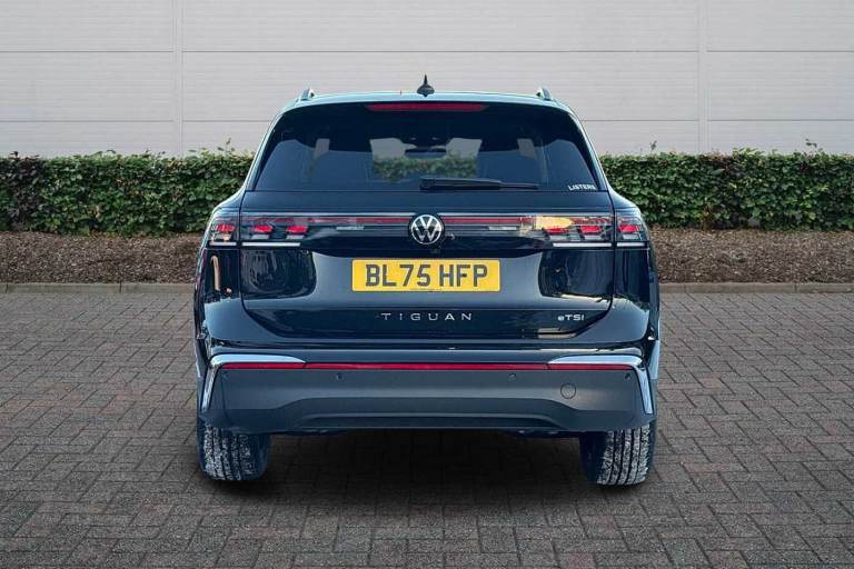 Available from 07/04/2026. Volkswagen Tiguan Estate 1.5 eTSI 150 Elegance 5dr DSG in Grenadilla Black. Specification Includes Exterior Features,Metallic paint,Packs,Infotainment package plus - Tiguan,Paint - Metallic,Metallic - Grenadilla black,Trim - Cloth,Art velours cloth - Soul,Wheels,19in Catania alloy wheels with black diamond turned surface and anti theft wheel bolts,Steel space saver spare wheel including tool kit and jack,Exterior Features,Heat insulating glass in side and rear windows,Heated rear window,Heated windscreen washer jets,Laminated safety glass from B-pillar backwards 90% tinted,Laminated safety glass windshield,Rain sensor windscreen wipers,Rear wiper,Front wheel drive,Air intake with Chrome trim,Body colored bumpers in R-Line style,Body coloured door handles,Chrome moldings on the side windows,Illuminated door handle recesses,Rear side wing doors,Silver roof rails,Ambient lighting with logo projection,Automatic headlight control system,Coming/leaving home lighting function,High level 3rd brake light,Illuminated lightline between headlamps,LED Day time running light,Rear fog light on one side- reversing light on both sides,Safety,Electronic parking brake with auto hold,Front disc brakes,Hill start assist,Rear disc brakes,Adaptive cruise control (ACC),Advanced driver attention and drowsiness monitor,Comfort drive travel assist- lane keeping system- lane assist and emergency assist,Dynamic road sign display,Front Assist - Autonomous emergency braking with pedestrian and cyclist monitoring,Lane change system- Side assist- Rear traffic alert and Exit warning system,Multifunction front facing camera,Oncoming vehicle braking when turning including swerve support,Park assist pro with park distance control (Remote park assist),Power assisted steering with speed sensitive,Auto dimming interior rear view mirror,Body-coloured exterior mirror housings,3 point seat belt for centre rear seats,3 Point seat belts in front with pretensioners,3 point seatbelts in outer rear with ECE label,Driver and front passenger airbag with front passenger airbag deactivation,Front and rear curtain airbags,Front and rear side airbags,Front centre airbag,Manual child proof rear door locks,Two tone horn,Warning triangle,Interior Features,Carpet mats- front and rear,Air care climatronic 3 zone air conditioning system with rear air conditioning control panel,12V outlet in center console rear and in luggage compartment,12V socket in centre console,Centre console with