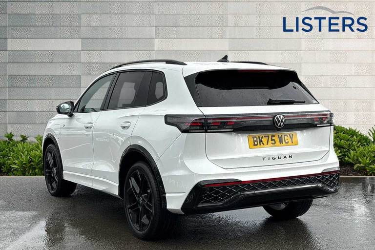 Available from 31/03/2026. Volkswagen Tiguan Estate 1.5 TSI 272 eHybrid R-Line 5dr DSG in Oryx White Premium Mother-of-Pearl. Specification Includes Wheels,20in York Black style alloy wheels with anti theft wheel bolts,Packs,Black style package - Tiguan R-Line/Black edition,Driver assistance package - Tiguan,Harman Kardon Sound Package - Tiguan eHybrid,Infotainment package plus - Tiguan,IQ.LIGHT - HD matrix headlights pack - Tiguan R-Line,Paint - Special,Premium paint - Oryx white Mother-of-pearl,Trim - Cloth,Greyson sports cloth - Soul,Exterior Features,Heat insulating glass in side and rear windows,Heated rear window,Heated windscreen washer jets,Laminated safety glass windshield,Rain sensor windscreen wipers,Rear wiper,Adaptive chassis control DCC pro includes driving mode selection,Front shock absorption,Front wheel drive,Rear shock absorption,Air intake with Chrome trim,Body coloured door handles,Chrome moldings on the side windows,Illuminated door handle recesses,Rear side wing doors,Ambient lighting with logo projection,Automatic headlight control system,Coming/leaving home lighting function,High level 3rd brake light,Illuminated lightline between headlamps,LED Day time running light,Rear fog light on one side- reversing light on both sides,Safety,Electronic parking brake with auto hold,Front disc brakes,Rear disc brakes,Adaptive cruise control (ACC),Advanced driver attention and drowsiness monitor,Dynamic road sign display,Front Assist - Autonomous emergency braking with pedestrian and cyclist monitoring,Lane change system- Side assist- Rear traffic alert and Exit warning system,Lane keeping system Lane Assist,Oncoming vehicle braking when turning including swerve support,Park assistance plus with front and rear parking sensors,Power assisted steering with speed sensitive,Progressive steering,Auto dimming interior rear view mirror,Puddle lights and reverse activated passengers door mirror,3 point seat belt for centre rear seats,3 Point seat belts in front with pretensioners,3 point seatbelts in outer rear with ECE label,Driver and front passenger airbag with front passenger airbag deactivation,Front and rear curtain airbags,Front and rear side airbags,Front centre airbag,Manual child proof rear door locks,Two tone horn,Warning triangle,Interior Features,Carpet mats- front and rear,Air care climatronic 3 zone air conditioning system with rear air conditioning control panel,12V outlet in center console rear and in luggage compartment,12V socket in