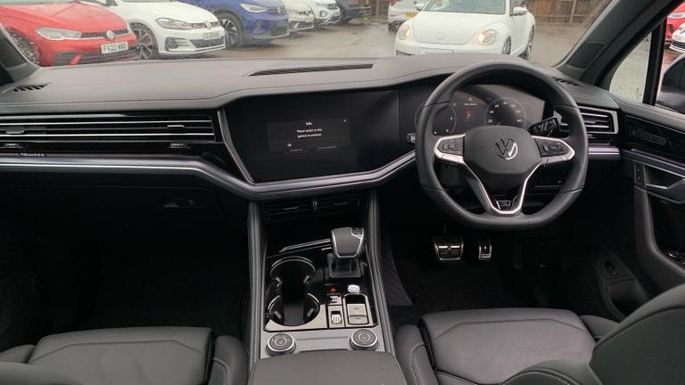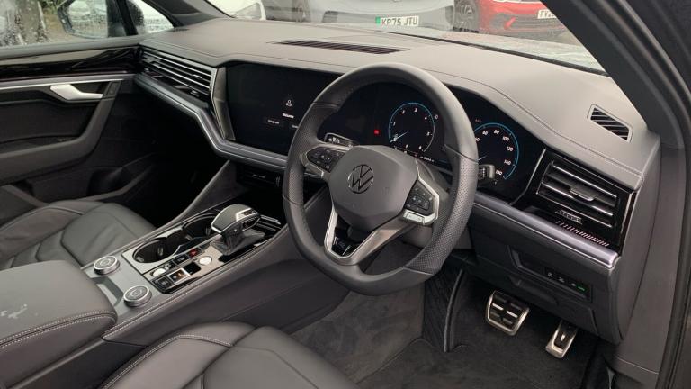 This 2025 Volkswagen Touareg Black Edition 286PS is a one owner vehicle from new, previously an ex directors car, combining luxury, performance and cutting edge technology. It has been meticulously maintained with a full Volkswagen service history, including its first service completed in 2025, ensuring it is in pristine condition.The Black Edition specification is exceptional and includes a factory upgraded heated acoustic windscreen for added comfort, as well as Park Assist Pro, which allows smartphone remote control so you can park your vehicle from outside using your phone. Additional features include a 360 degree camera system, air suspension for a smooth and adaptable ride, an electric tailgate and a large 15 inch centre display paired with a digital cockpit display, providing a highly intuitive and connected driving experience.With its powerful 286PS engine, full main dealer service history and remarkable specification, this Touareg Black Edition offers a perfect combination of luxury, technology and practicality, making it a highly desirable SUV for its next owner..Satellite Navigation, Panoramic Roof, Full Service History, Manufacturer Approved, Adaptive cruise, Apple-Android Play& Rear Camera, Front + rear carpet mats, Rear wiper, Rear tinted glass from B pillar backwards, approx 65% tinted, Rain sensor, ABS, Front assist, Generative braking with start and stop system, Adaptive chassis control, Wireless app connect, Mobile phone interface with inductive charging, E-Sim card for online connectivity, PAS, Adaptive cruise control, Intelligent park assist, Driver profile selection, Dynamic road sign display, Area view camera, Park Assist - Sensor controlled steering aid to assist parallel or bay parking, eCall emergency system, Warning signal and warning light for front and rear seatbelts not fastened, 15"" Screen Top infotainment system Premium (MIB3), Multi-colour Active Info display, Innovision cockpit, Black door mirrors, Electrically power adjustable, heated, folding, auto dimming