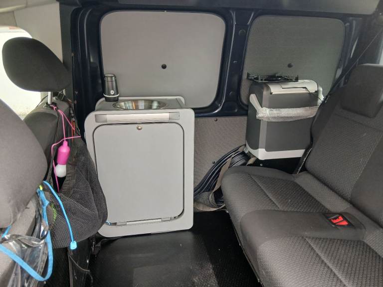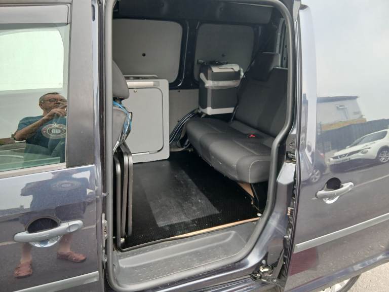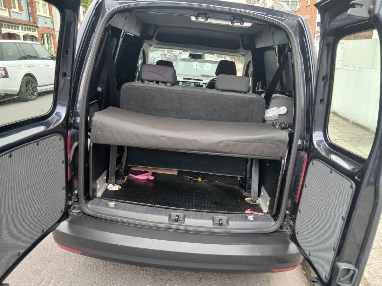 VW Caddy camper van for sale. Diesel. The vehicle was professionally converted by a specialist company based in Sussex in 2021. It comprises a fridge, grill, sink with water storage underneath, easily assembled worktop/table and double bed. CD player + DAB radio, second battery plus two seats in the rear.