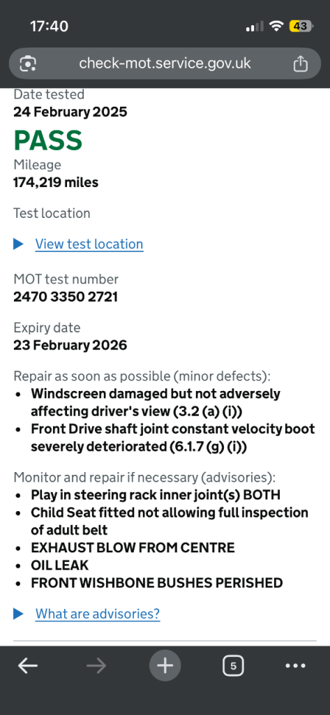 Runner for spares or repair, please review last MOT for advisories and work likely required to pass next MOT. Needs to be collected before 22/02 otherwise going for scrap.