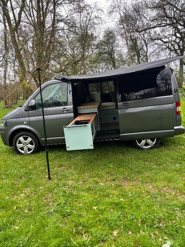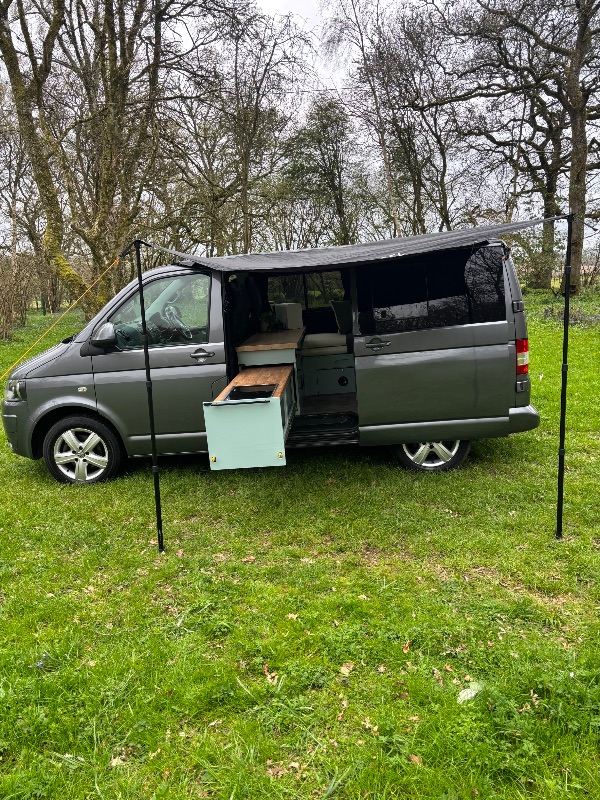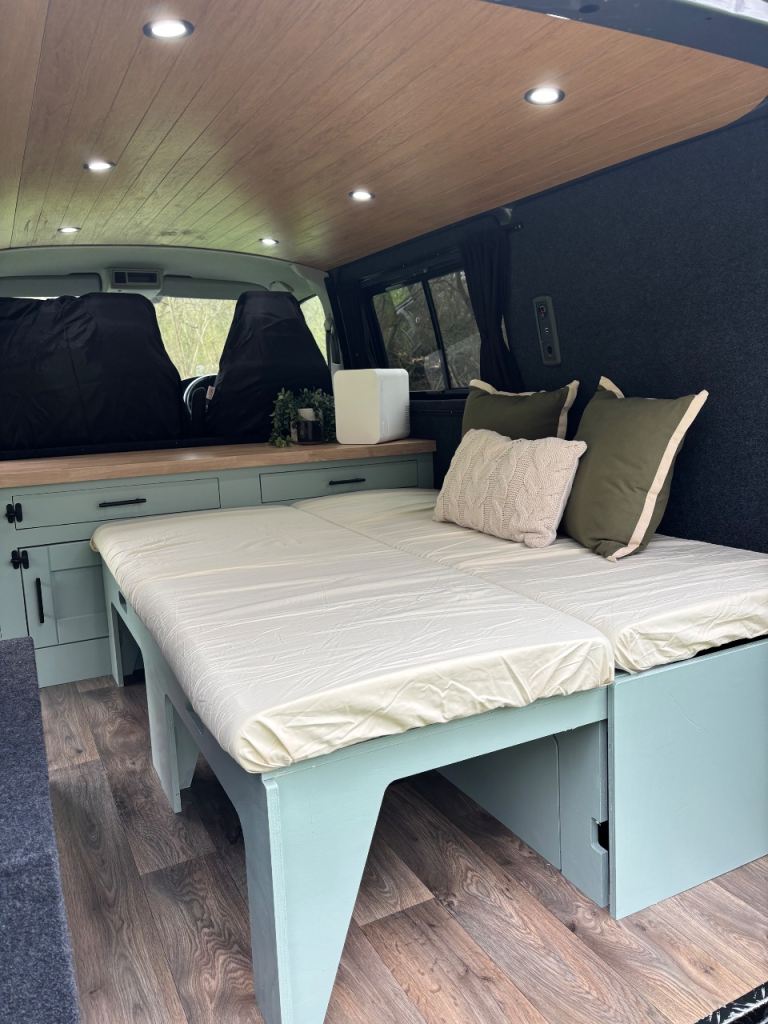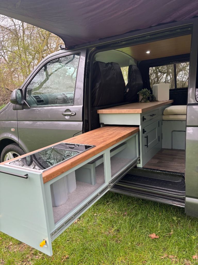 I’ve built: kitchenette featuring a gas hob, sink, fold down tap and glass lid, double bed stowed as a sofa and an awning