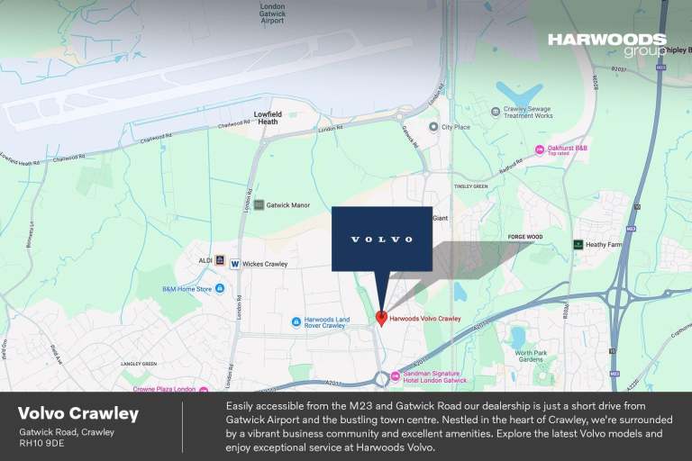 Our Volvo Crawley dealership is located on Gatwick Road in Crawley and is easily accessible via the A2011. Here we have a range of new Volvo vehicles, with models including the Volvo S60, the Volvo V90 and the Volvo XC40. We also have a selection of hybrid vehicles, which includes the S90 Recharge and V60 Recharge as well as the all electric XC40 Recharge. Harwoods Volvo are extremely proud to receive Electric Vehicle Approved (EVA) accreditation. At Volvo Crawley we stock a range of approved used Volvo cars from the V40 to the XC90. We are recognised as a manufacturer-approved centre for servicing to keep your car in the best condition. We offer premium accessories to benefit your vehicle, family and pets and have several servicing plan options available to suit your needs. Contact our team at Volvo Crawley today for more information and to discuss purchasing a new or used Volvo, or to book a service.