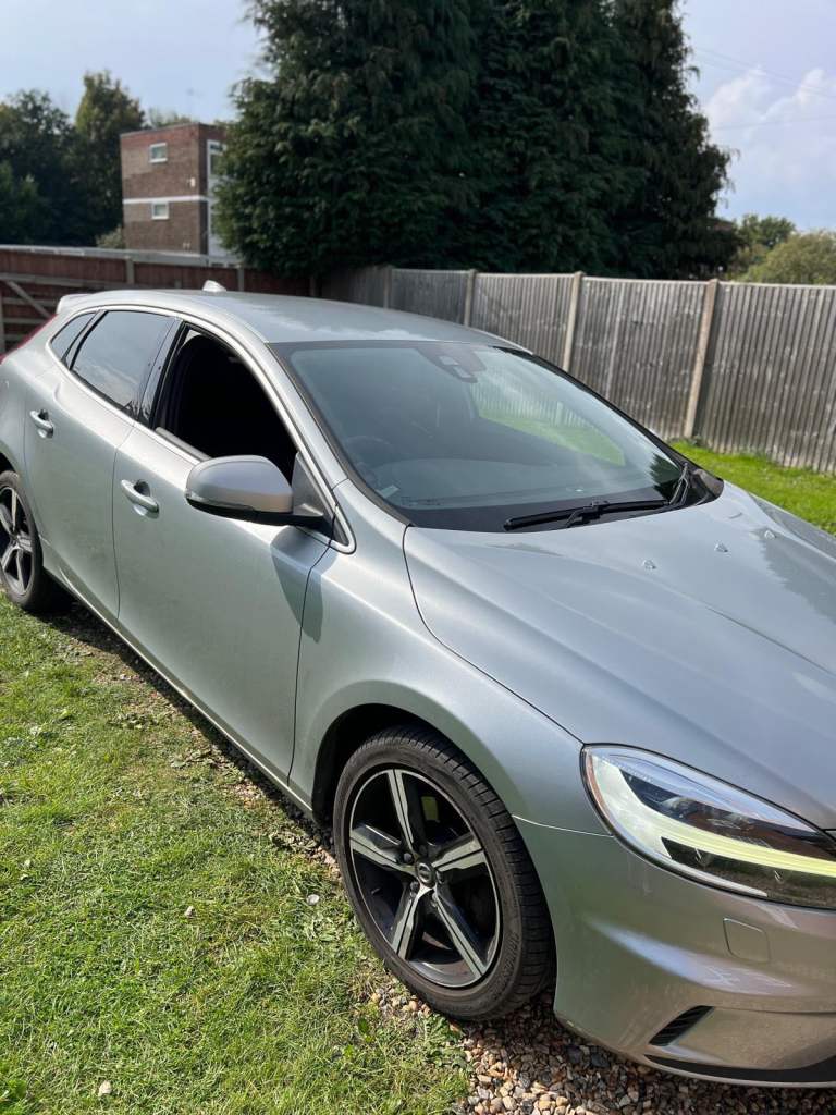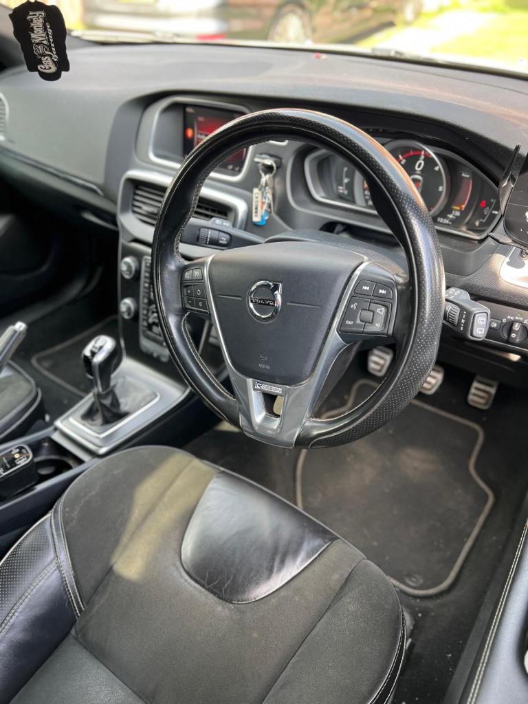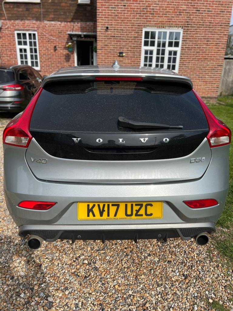 2017 Volvo V40 R-Design Nav Plus in silver, 2.0L diesel. This is the R-Design trim with sporty styling and comes equipped with Bluetooth, DAB radio, USB and AUX, dual-zone climate control, cruise control with speed limiter, R-Design sports seats, a leather steering wheel, alloy wheels and LED daytime running lights. Safety features include Volvo City Safety, multiple airbags and ISOFIX.
