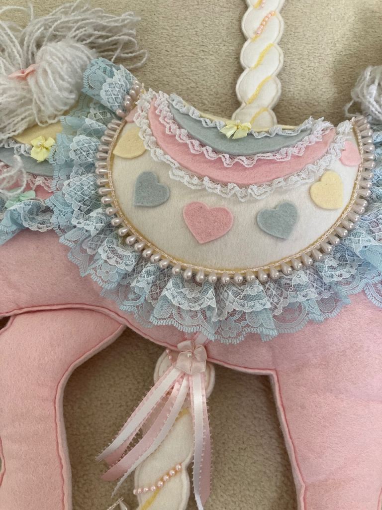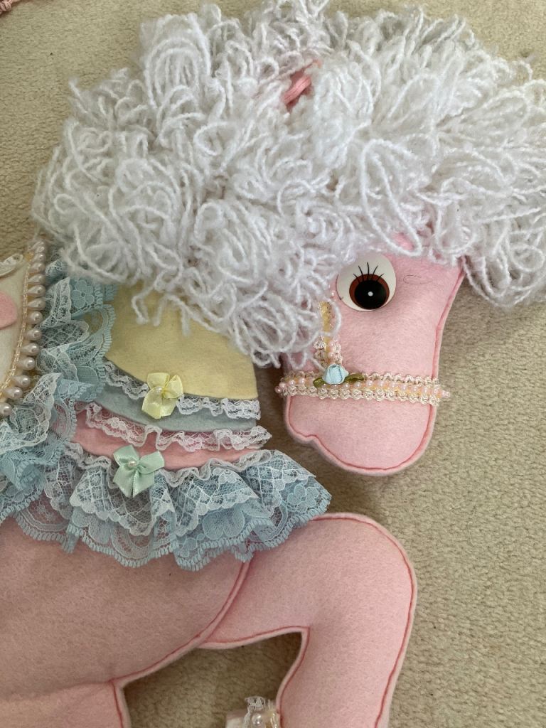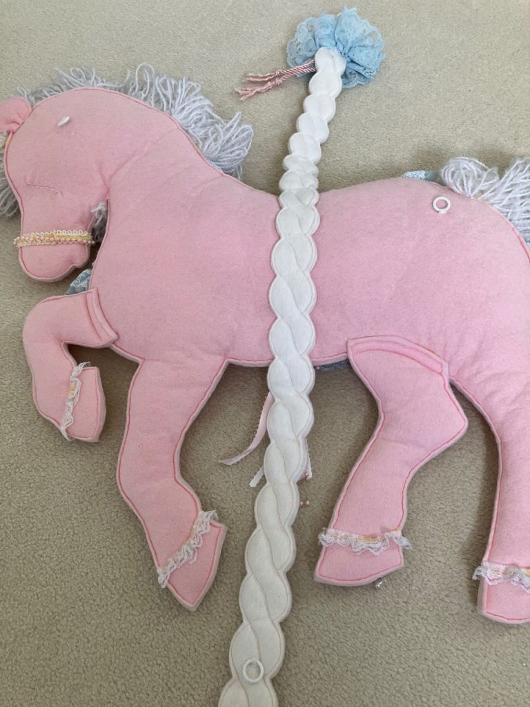Fabric wall hanging, carousel horse design, great for a nursery or child’s bedroom, has hooks on the back to hang on the wall.