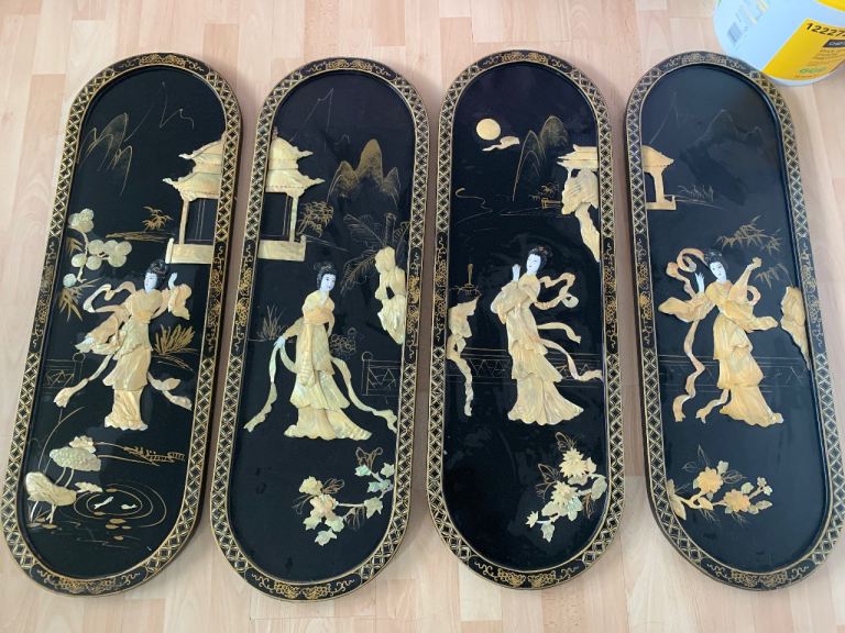 Includes a tree design with leaves and birds, and two abstract patterned panels.