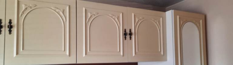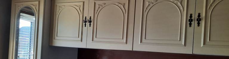 This wardrobe unit comes with 2 single wardrobes and 3 double wall cupboards. Also included is the alcove and 2 bedside drawers. They are blemished by the sun, but can be revamped if you have the time to do it.