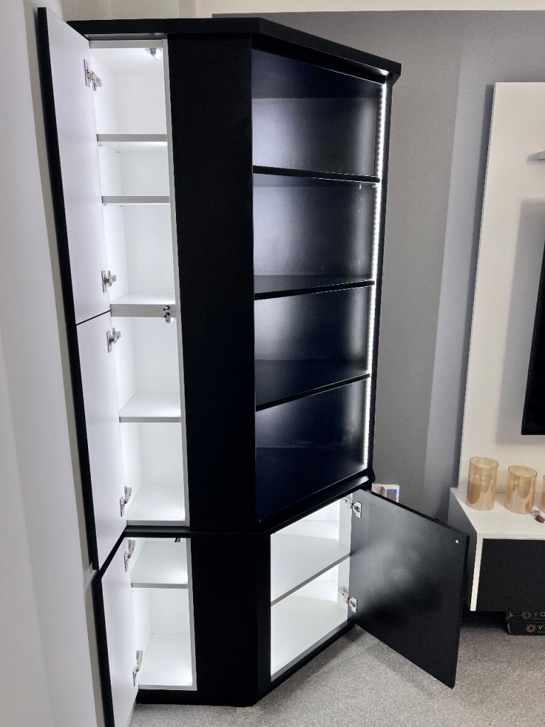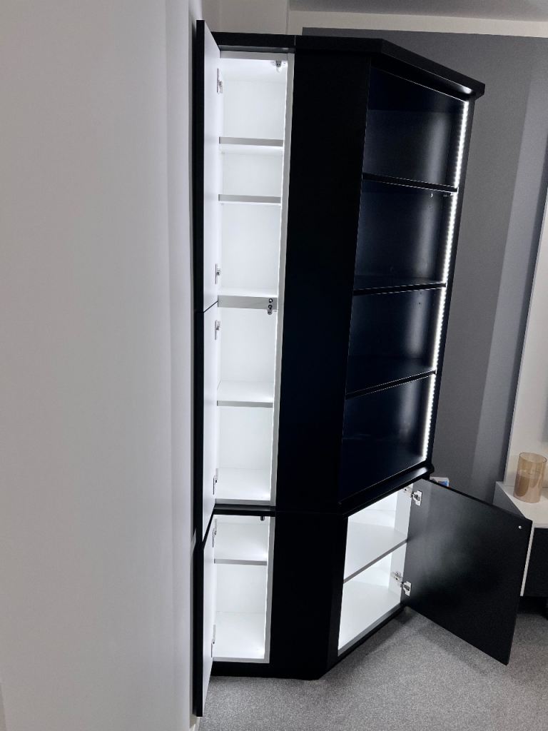 illuminated corner furniture / bar / consists of a closed lower part with open shelves and three side cabinets