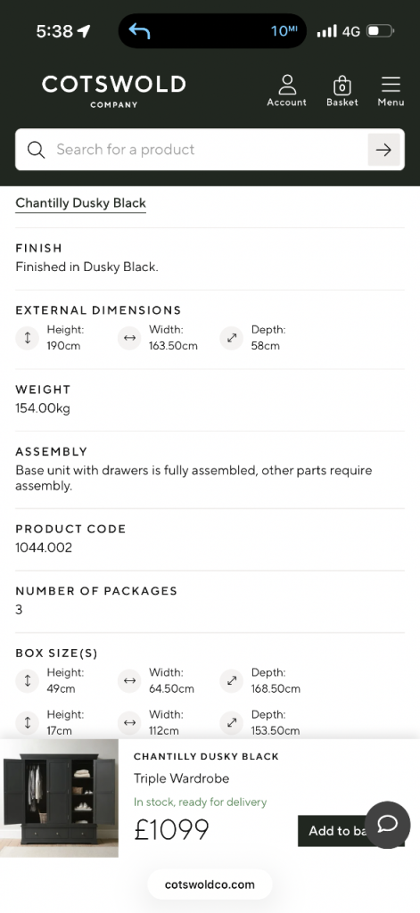 Posting for under a monthChantilly Triple Wardrobe from The Cotswold Company in the color Dusky Black.
