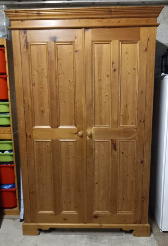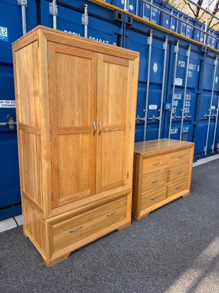 Large draw at bottom, great for jumpers or similar, 2 smaller draws, a wire draw inside, hanging rail and shelf above.