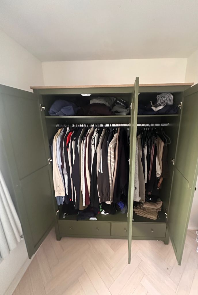 Designed with attention to detail, the Olney Triple Wardrobe features two spacious drawers, three doors, and two internal shelves. Its thoughtfully crafted layout provides room for your garments, ensuring easy access and organisation.