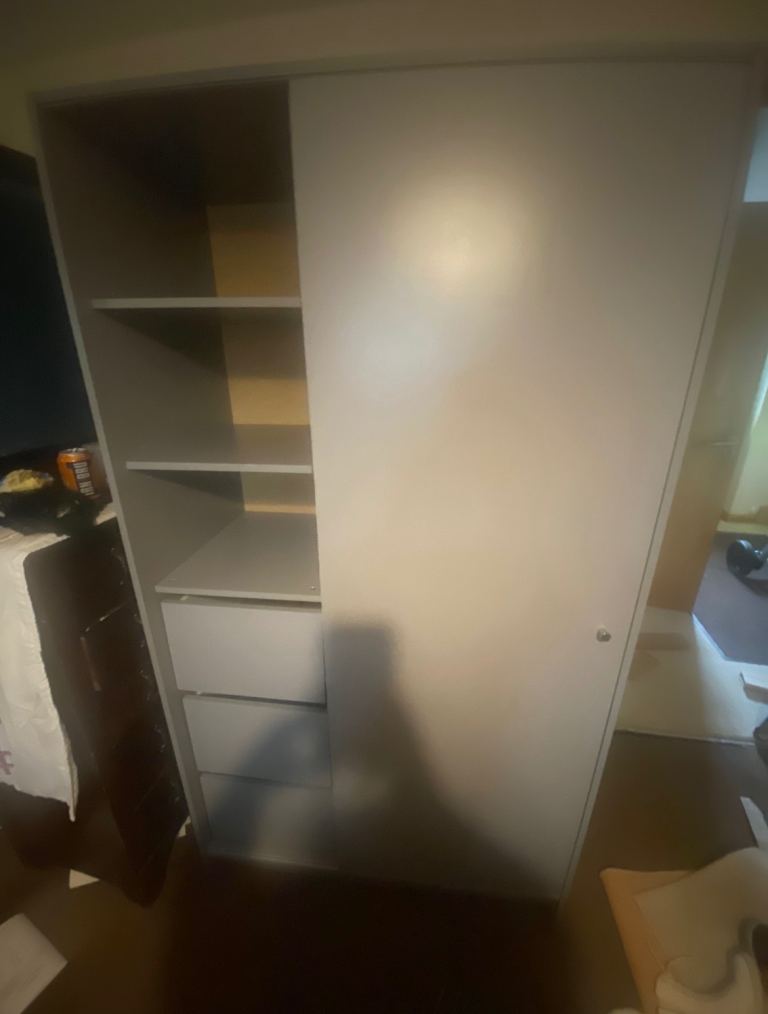 Grey sliding door double wardrobe with 3 drawers and 3 shelves. Please note the drawers will need new sliders, the wardrobe is ready to go now I can dismantle if requested please no time wasters buyer to collect balloch area of Inverness sizes in pictures.