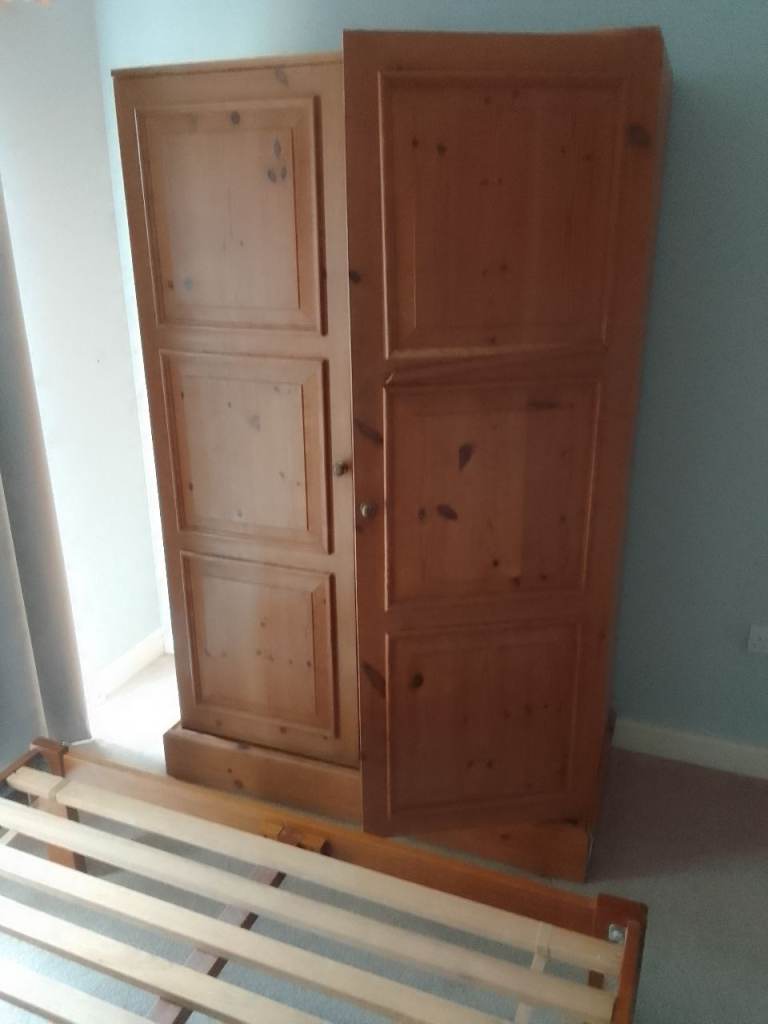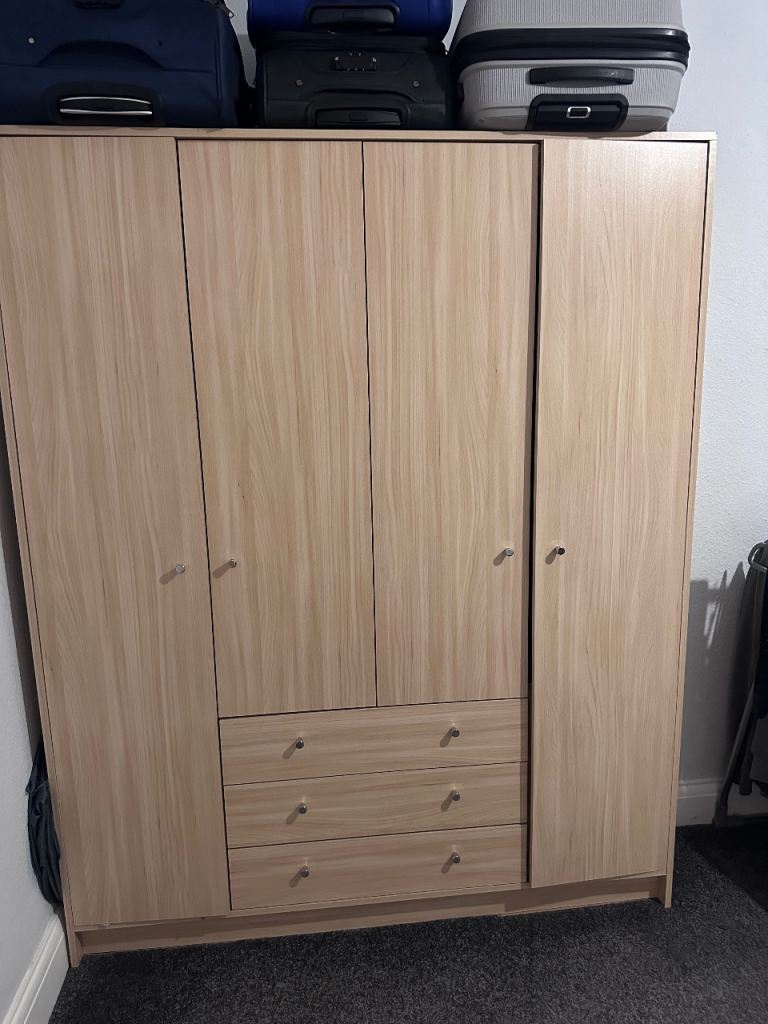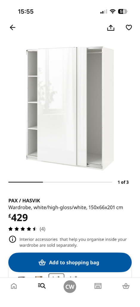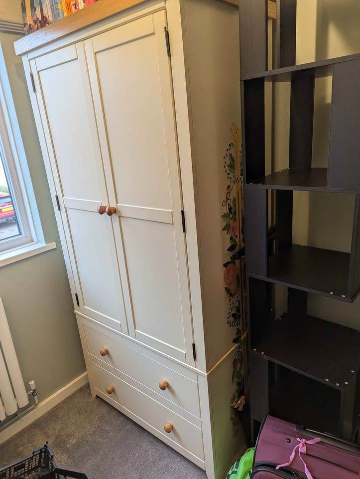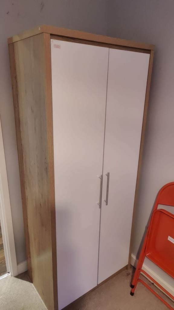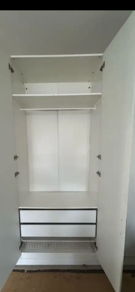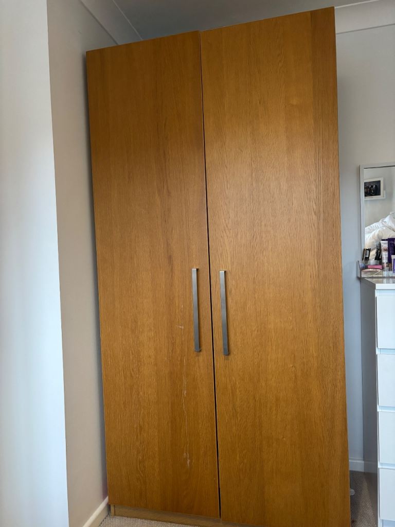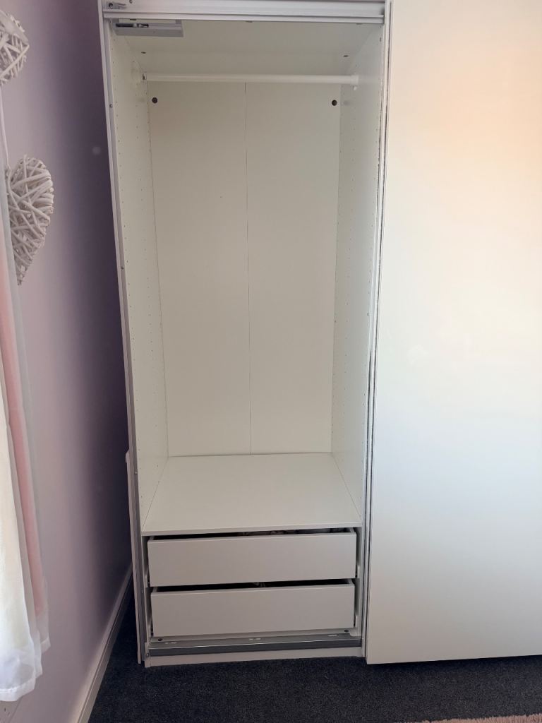 IKEA pax double wardrobe, with white high gloss sliding doors. One side has a longer side for the hanging section and 2 drawers at the bottom, the other has a small side for hanging and 4 drawers at the bottom. This can be changed depending on your preference. One of the doors has a small dent in, see picture but doesn’t affect the door from sliding. These still sell in ikea for over £400. The measurements are on the last picture.