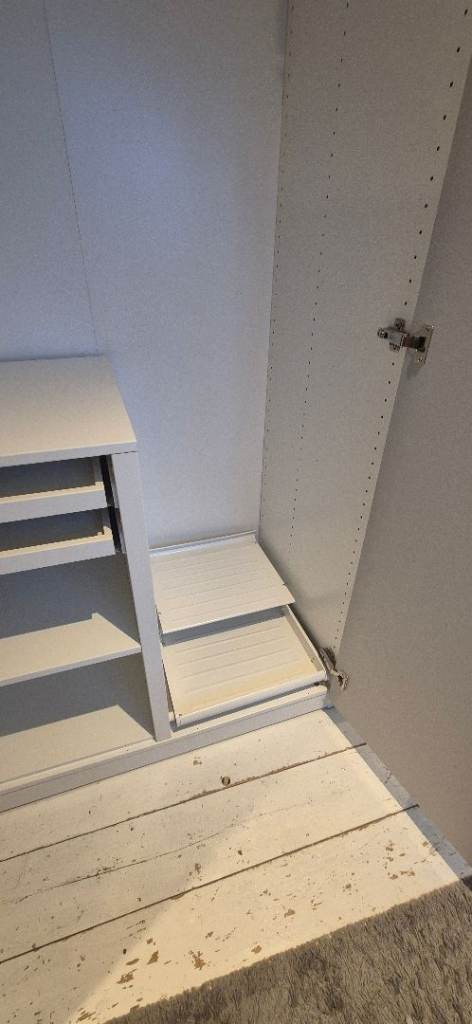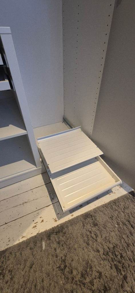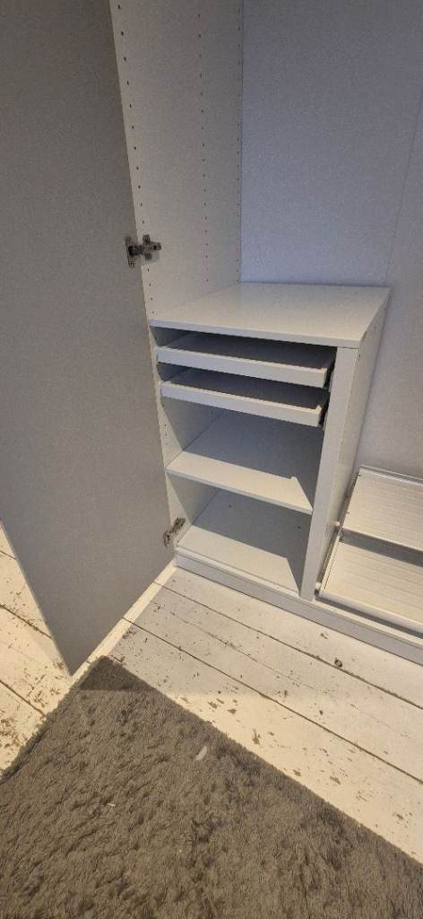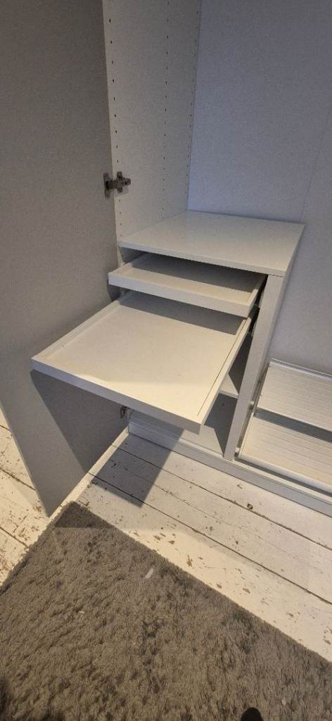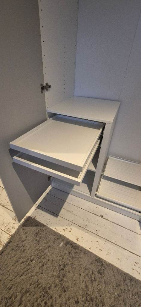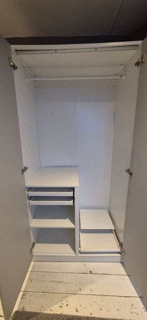 Internal- full clothes rail, pull our shoe shelf, two pull out trays. 2 square storage shelves.