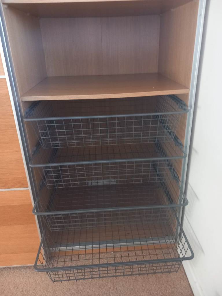 Sliding doors, hanging space, 4 shelves and 4 basket drawers