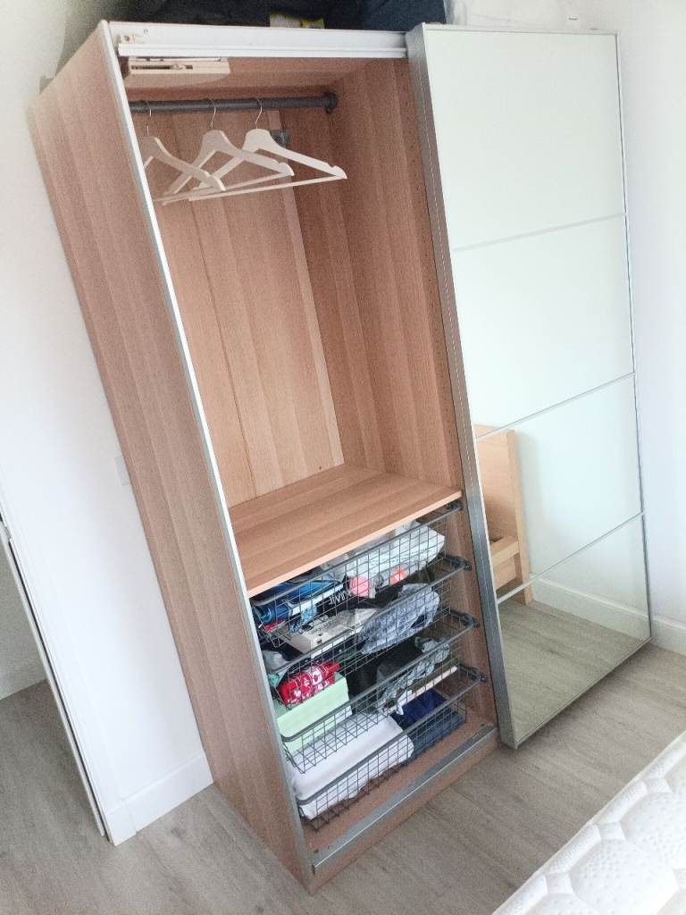 The IKEA Pax Wooden Double Wardrobe with Mirror Sliding Doors with wire basket drawers (4 drawers per unit) is a stylish and contemporary piece of furniture for any bedroom. Made from wood composite with a medium wood tone, this freestanding wardrobe features two rectangular mirrored doors that slide open for easy access. Measuring 200cm in height, 150cm in width, and 66cm in depth, this wardrobe is perfect for organising your clothes and belongings in a modern and sleek way. Assembly is required.